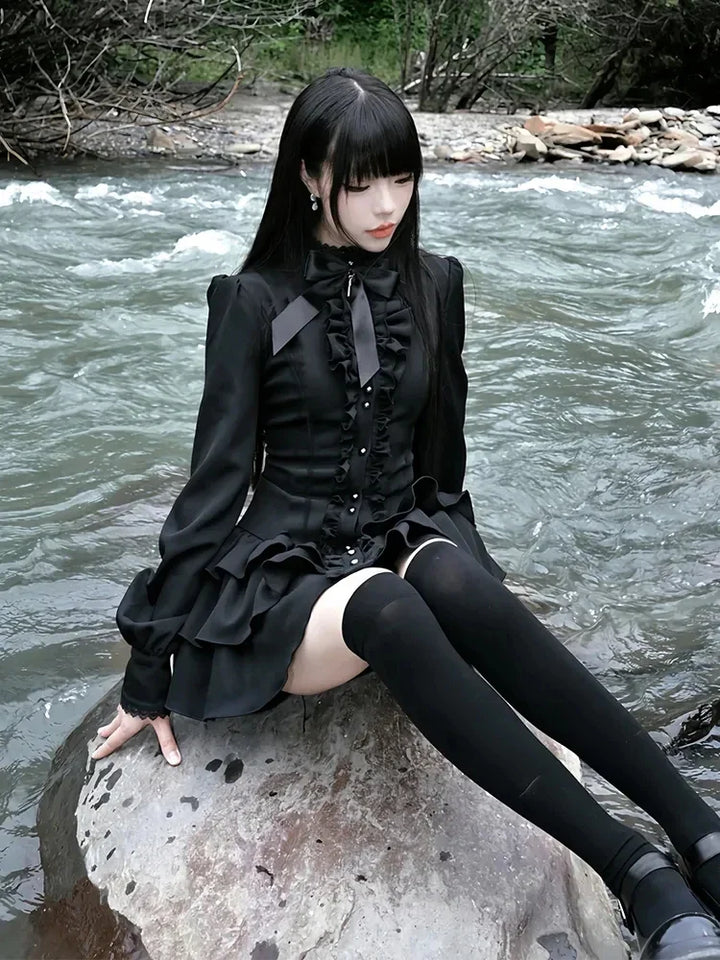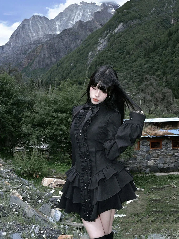 Step into a world of moonlit romance with this black gothic ruffle dress, crafted for dark coquette lovers, soft-goth aesthetics, and anyone who adores dramatic silhouettes. With layered ruffles, corset-style details, and a sculpted waist, this dress transforms you into a midnight doll the second you put it on.