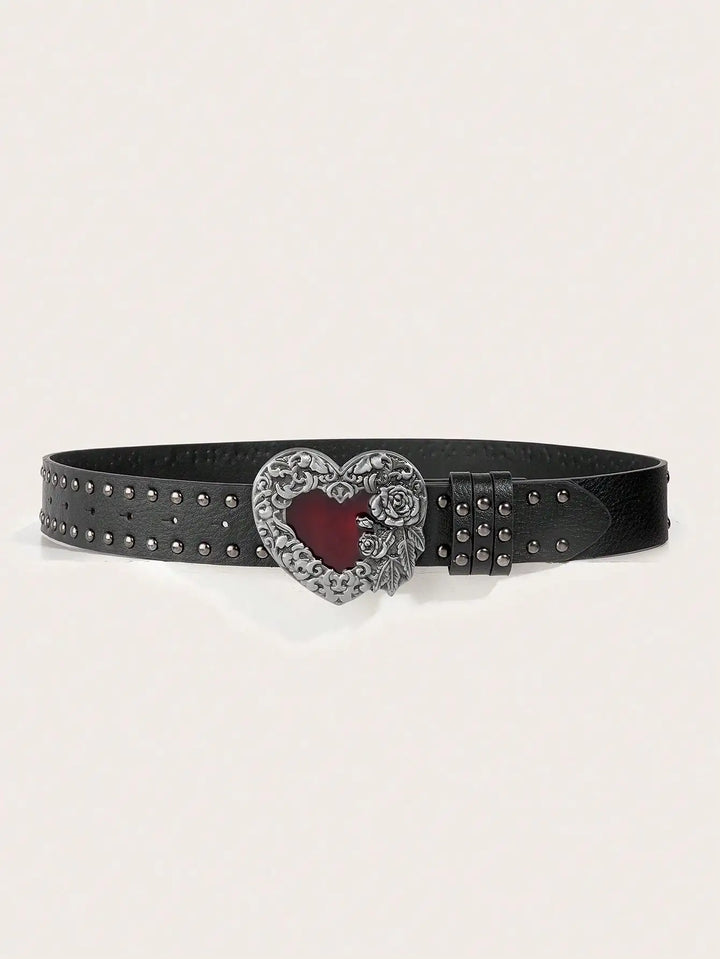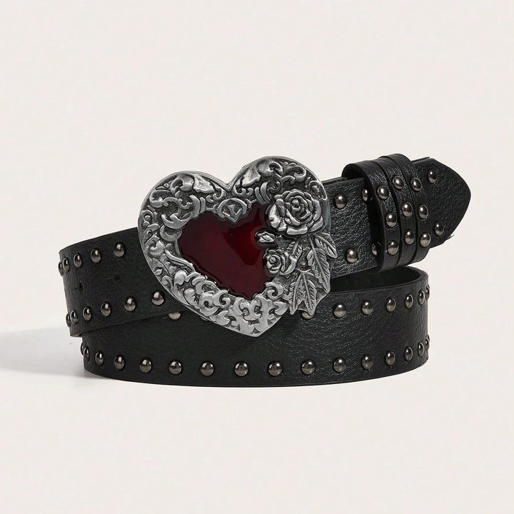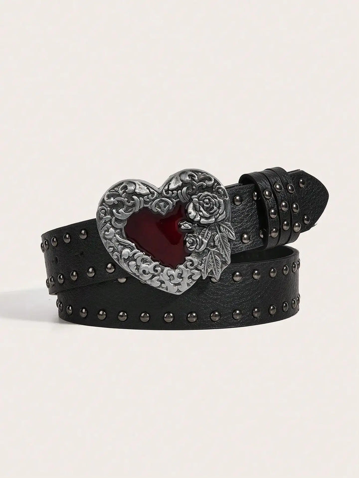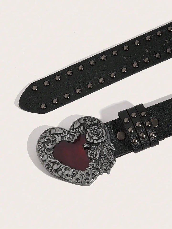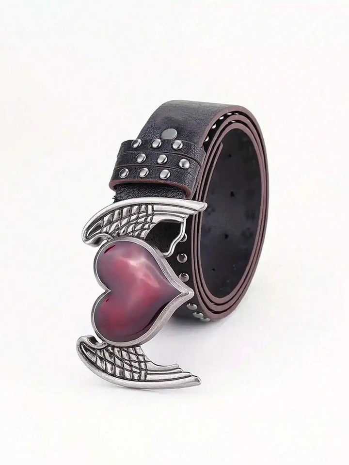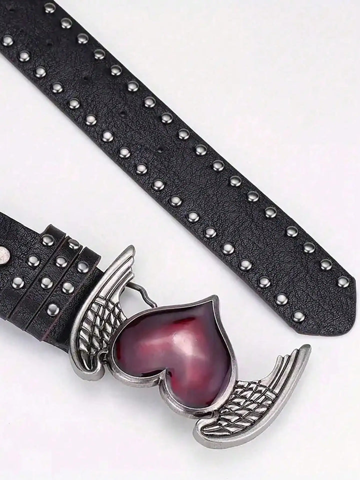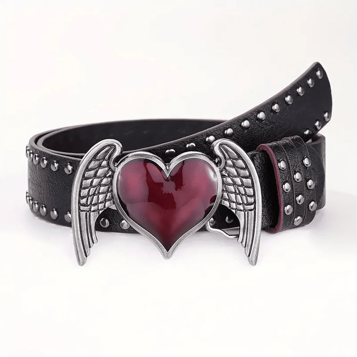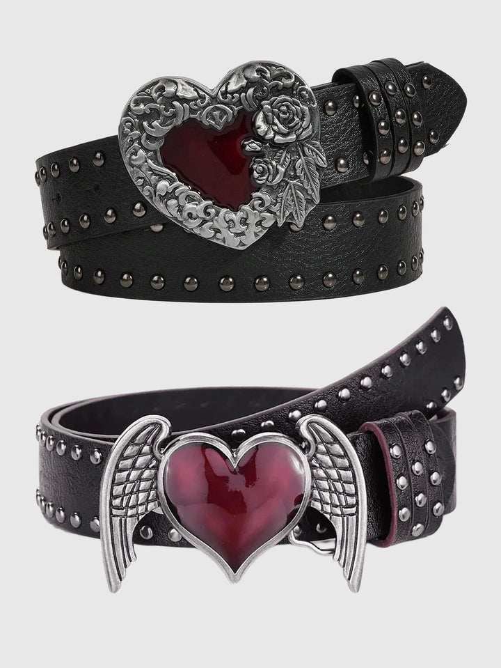 The thick faux-leather strap curves around the waist with tiny metal studs lining the edges for a sharp, punk-inspired finish. At the center sits a striking deep-red heart emblem framed in ornate silver metalwork — choose between the classic rose-heart design or the winged-heart version for extra angelic drama. The glossy heart centerpiece adds a touch of dark-fairy allure, making this belt the perfect mix of edgy and romantic.