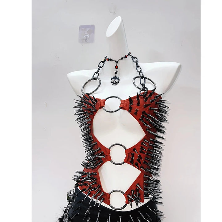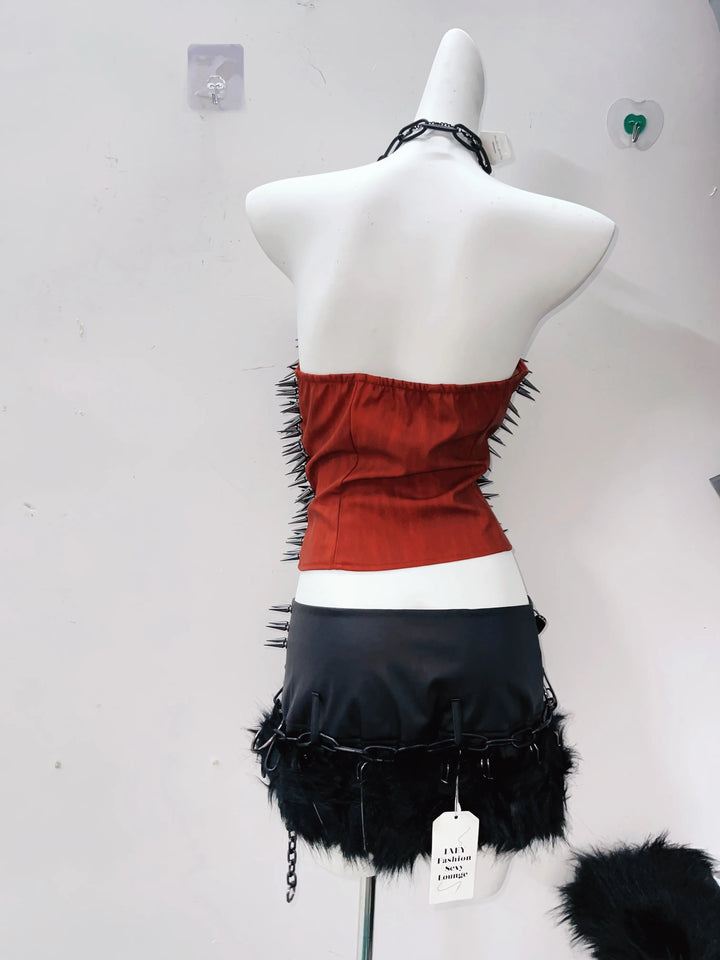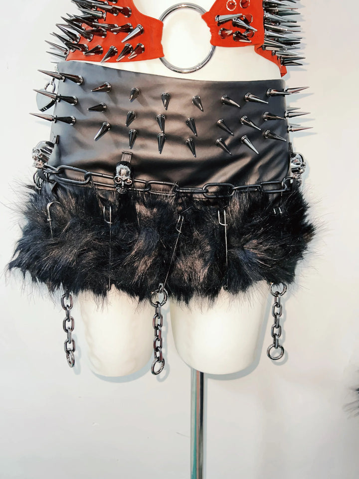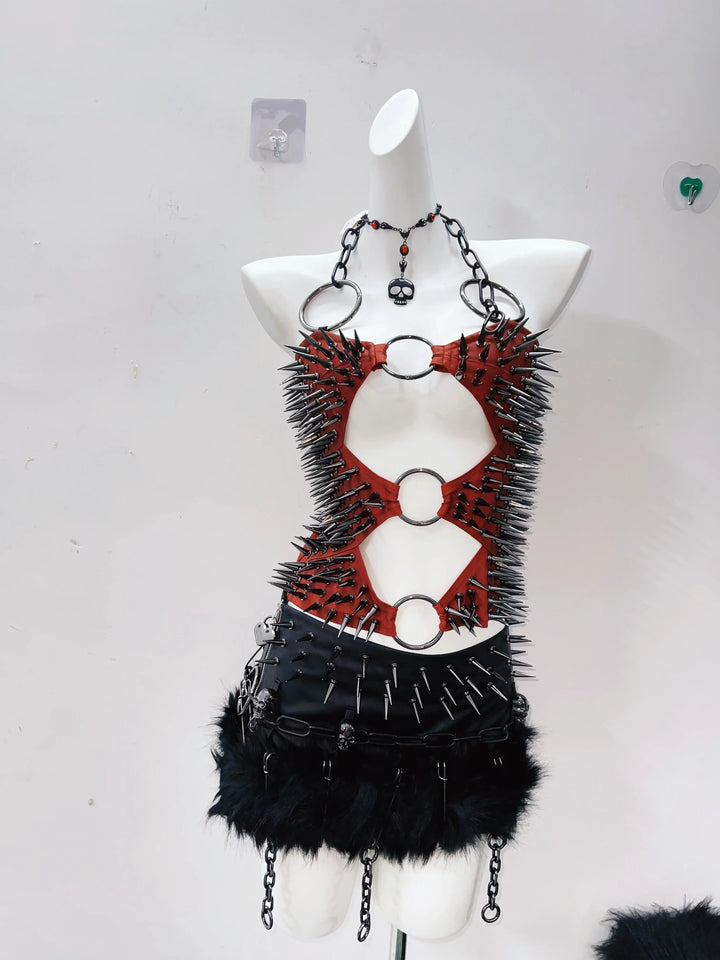The cut-out body harness design wraps the torso in a spine-like formation, while thick O-rings and link chains pull the entire silhouette together with raw industrial energy. Paired with the black faux-fur mini skirt slashed with steel spikes, every angle of this outfit hits like a weapon.