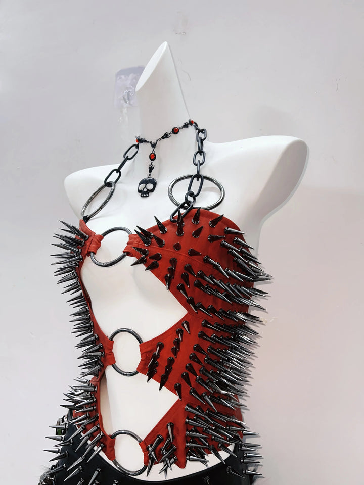 The Hellspike Rebellion Warrior Outfit Set is a brutal, high-intensity statement piece engineered for those who refuse to be ignored. Crafted with layers of sharp metal spikes, heavy chains, cut-out structure, and red-black contrast leather, this set delivers pure shock value and unmatched attitude.