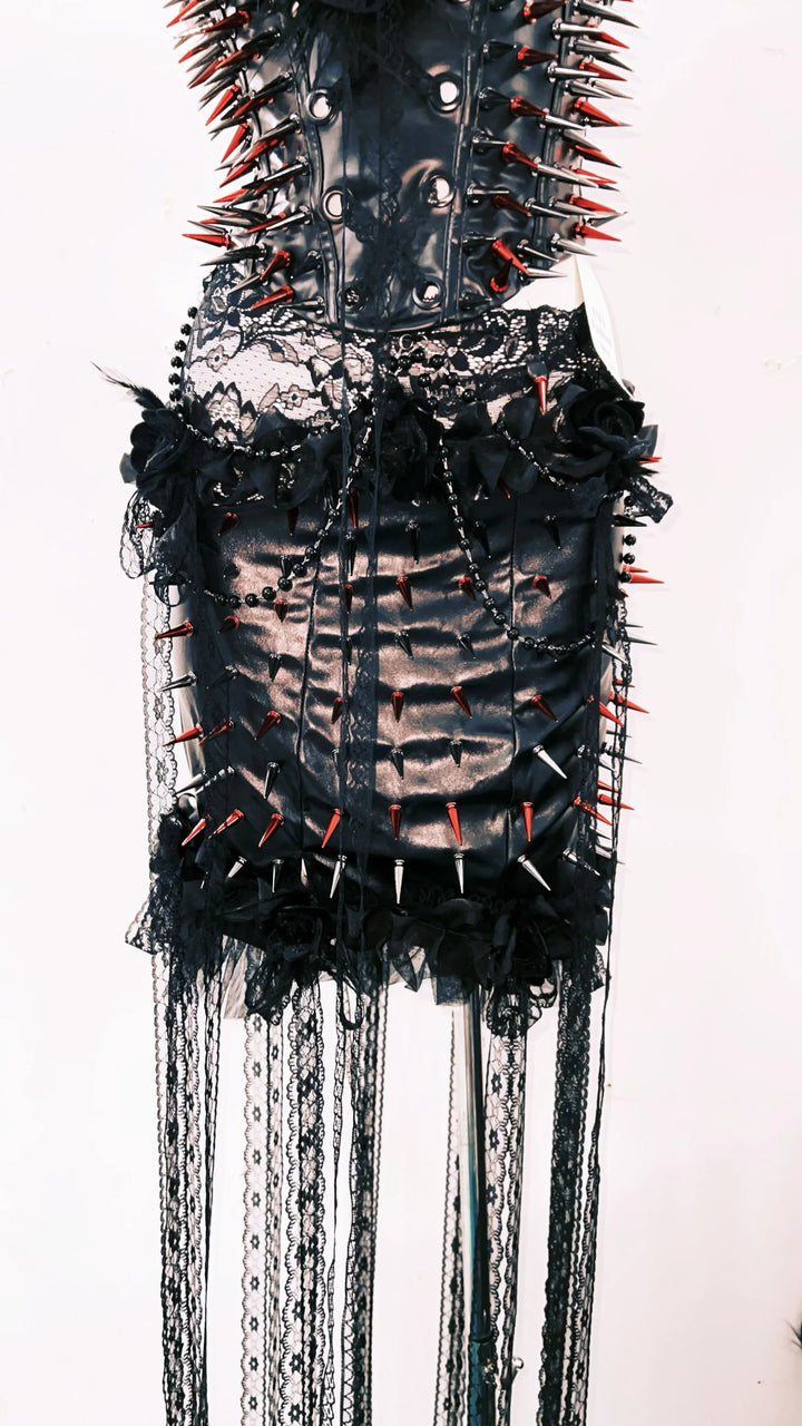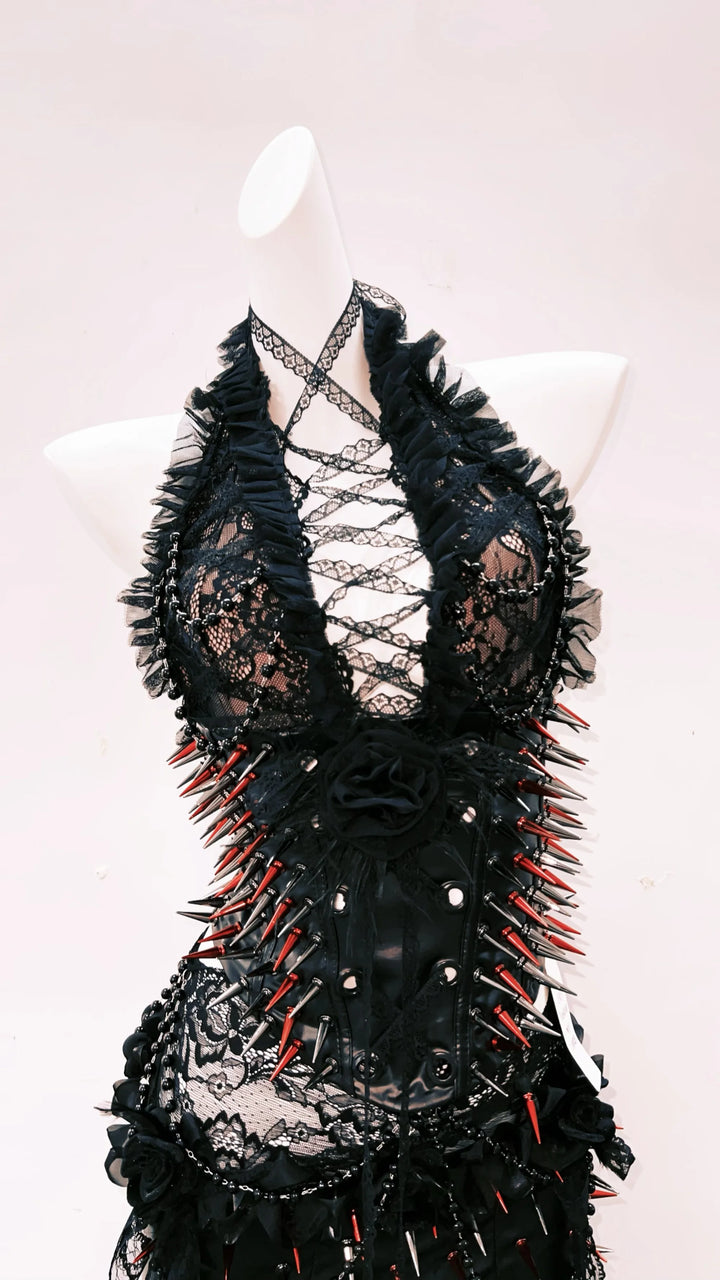 The halter-style top features intricate lace, corset-inspired structure, and a striking cage design across the chest. Red spikes line the sides and waist, creating a fiery silhouette that commands attention. The matching skirt keeps the drama going with layered lace, sharp accents, and a shaped fit that enhances every curve.