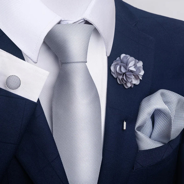• Complete gentleman’s kit — tie, pocket square, cufflinks, and lapel flower included in every set.