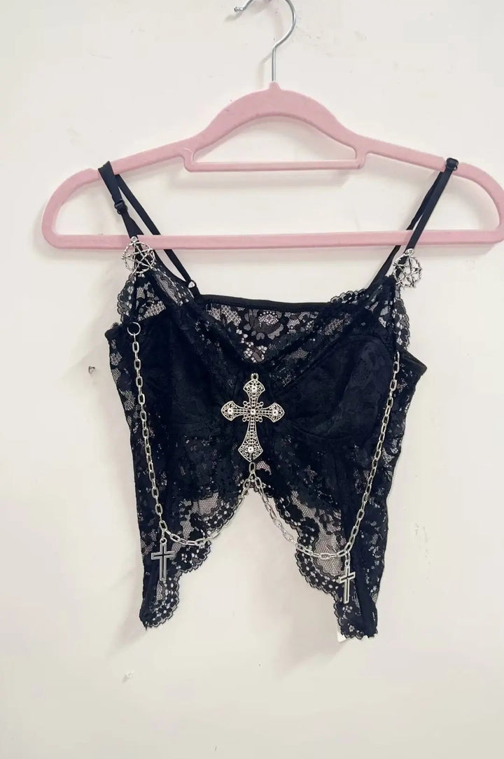 ✝️🖤 Midnight Cross Gothic Lace Chain Top 🖤✝️