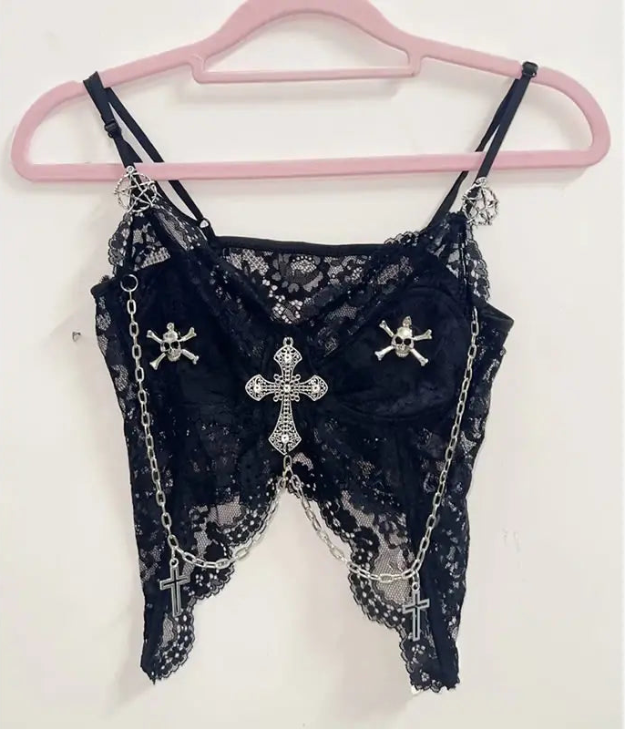Own the night with the Midnight Cross Gothic Lace Chain Top, a striking piece crafted for dark fashion lovers who crave drama and edge. Made from black floral lace and adorned with shimmering cross pendants, this top blends seductive elegance with gothic rebellion.