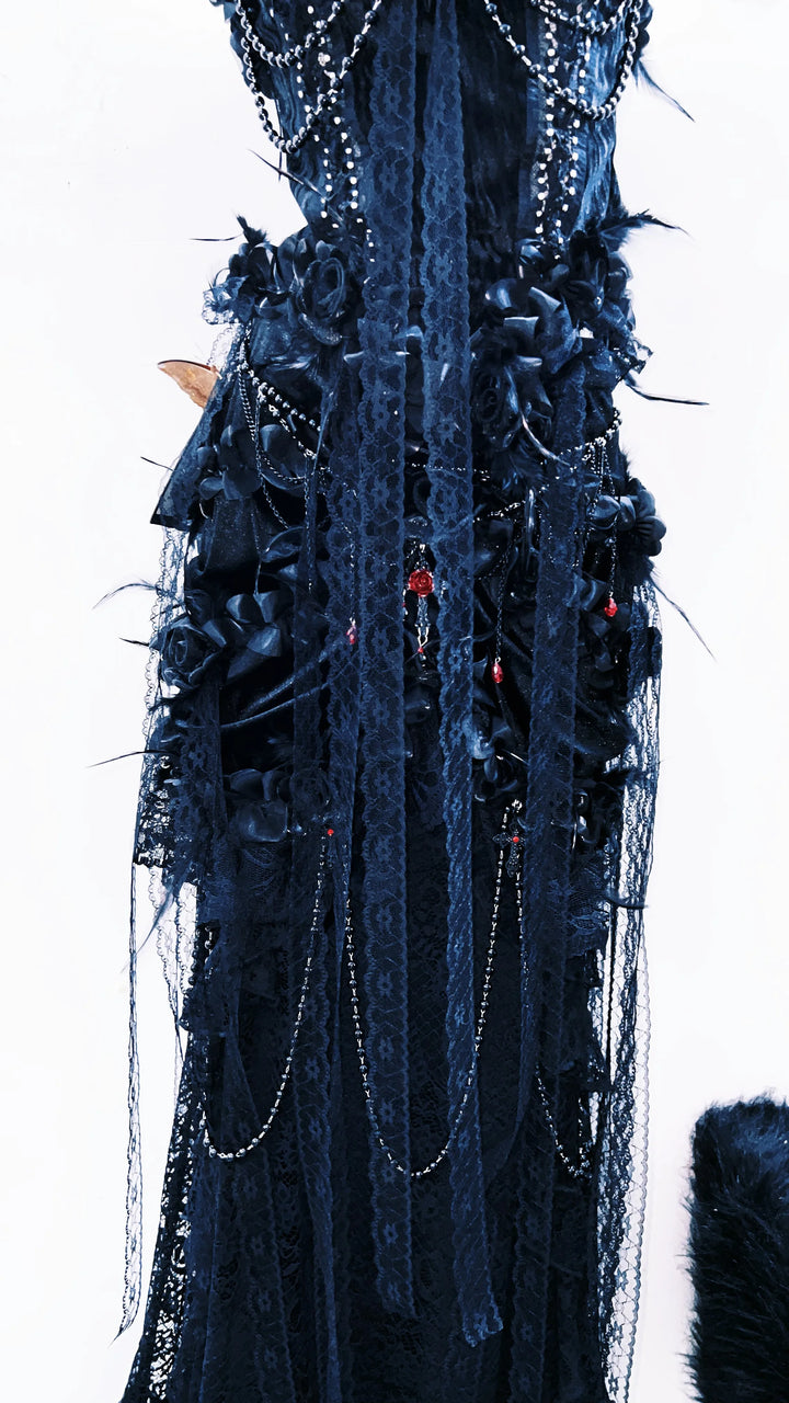 The long, trailing skirt flows with movement — rich with lace panels, tattered ribbons, and embroidered textures that give the gown depth, dimension, and a shadowy elegance worthy of a gothic queen.