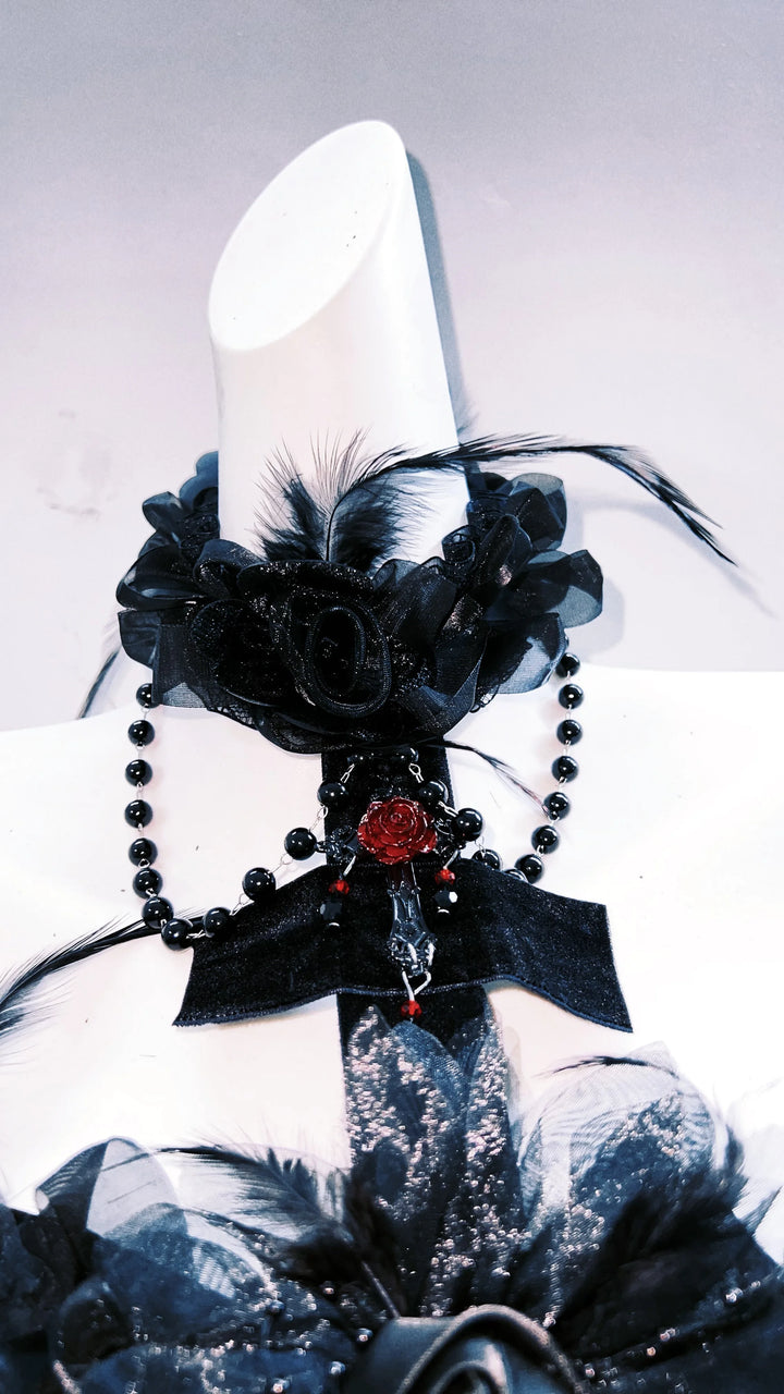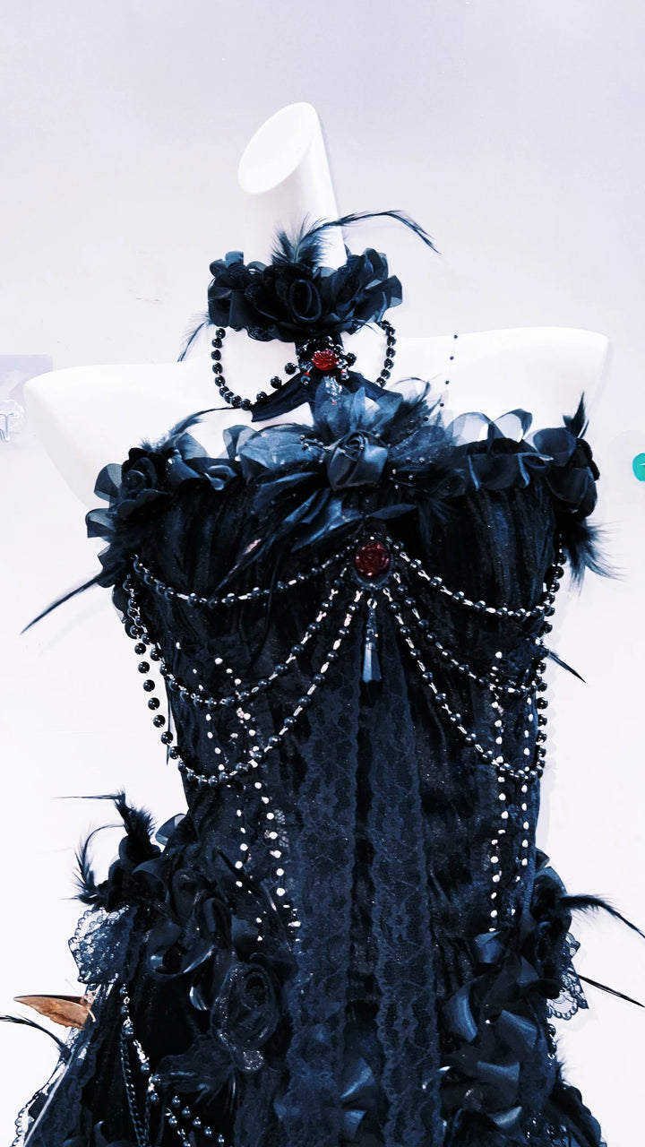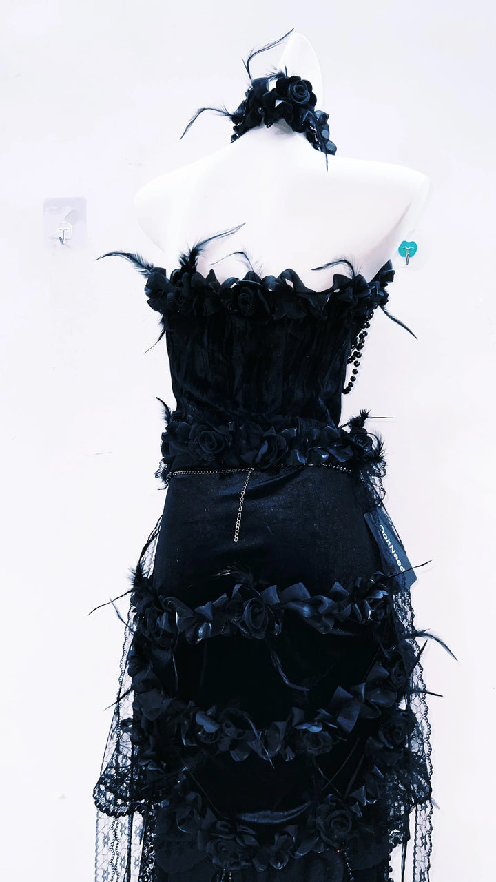 The sculpted corset bodice is adorned with hand-placed roses, textured lace, feather accents, and draped chains that gleam softly under light. The neckline features a dramatic gothic choker detail with beads and a crimson rose centerpiece, framing the shoulders in haunting beauty.