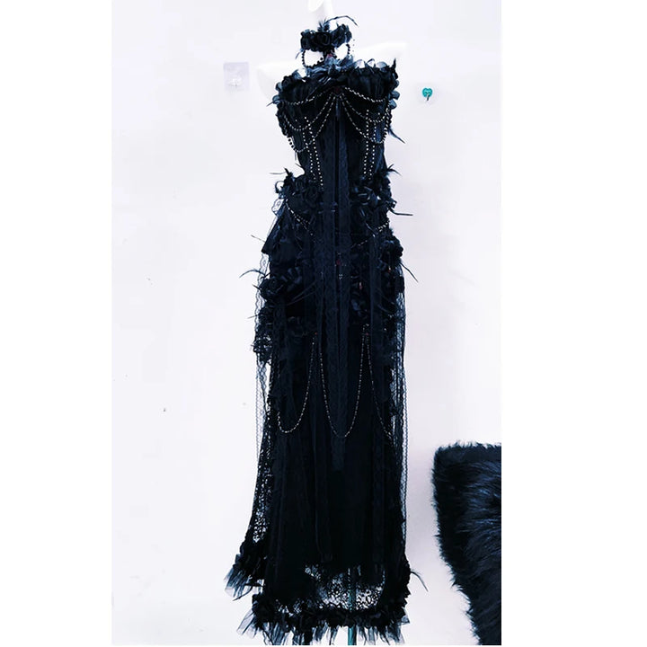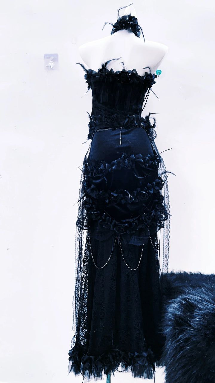 Command the night with the Midnight Widow Gothic Elegance Gown, a breathtaking floor-length masterpiece dripping in black roses, layered lace, and cascading chains. This dress blends dark romance with high gothic drama, creating a silhouette that looks straight out of a forbidden fairytale.