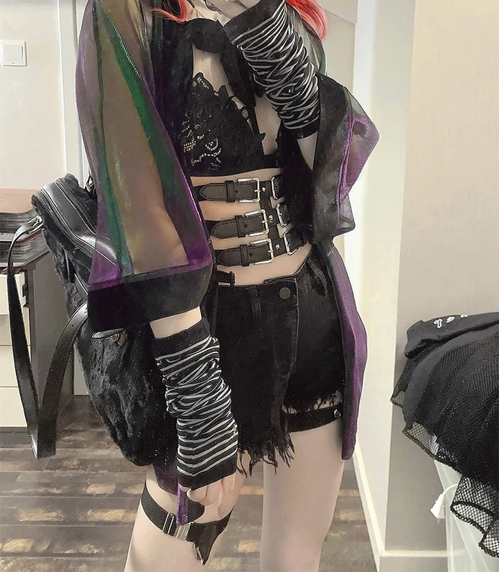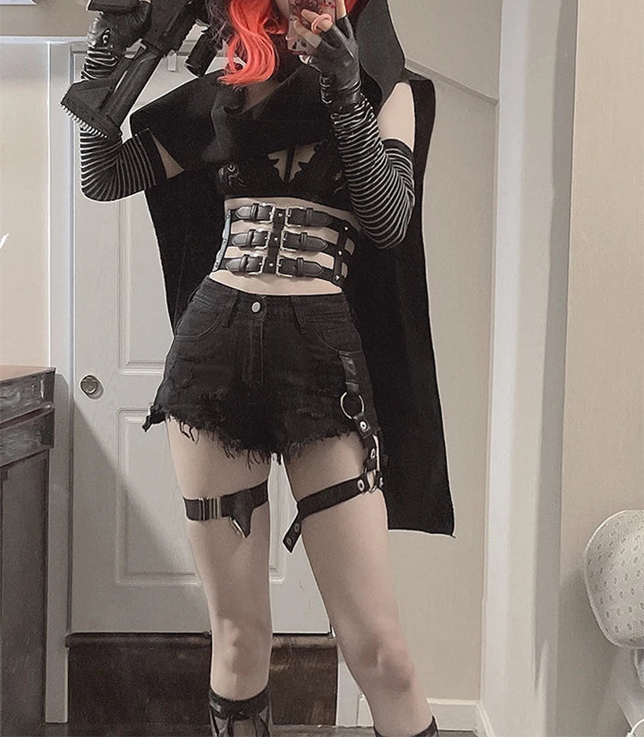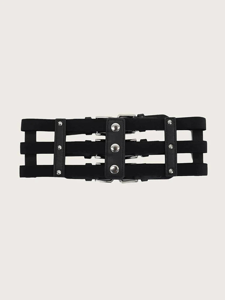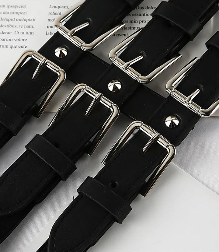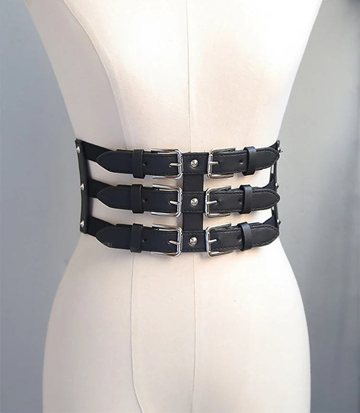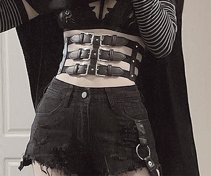 Four faux-leather straps wrap tightly around the waist, each secured with chunky silver buckles that give the piece an industrial, cage-like structure. The open design creates a dramatic cinched effect while keeping the look raw and breathable. Silver hardware, strong stitching, and a tight, minimalist layout make it a perfect blend of grunge practicality and punk-fashion impact.