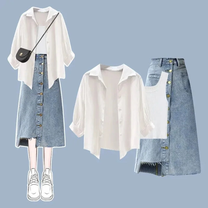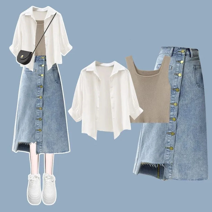 👗 3-Piece Coordinated Set – Includes a lightweight blouse, knitted tank top, and A-line denim skirt for a complete outfit.