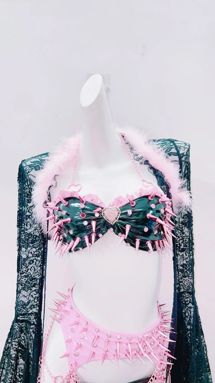 Step into a sweet-but-dangerous fantasy with the Sugar Goth Lace Fantasy Outfit Set, a striking mix of bubblegum-pink ribbons, dark lace, and playful feather trims. This set blends cute and seductive elements into one irresistible coquette-goth look.