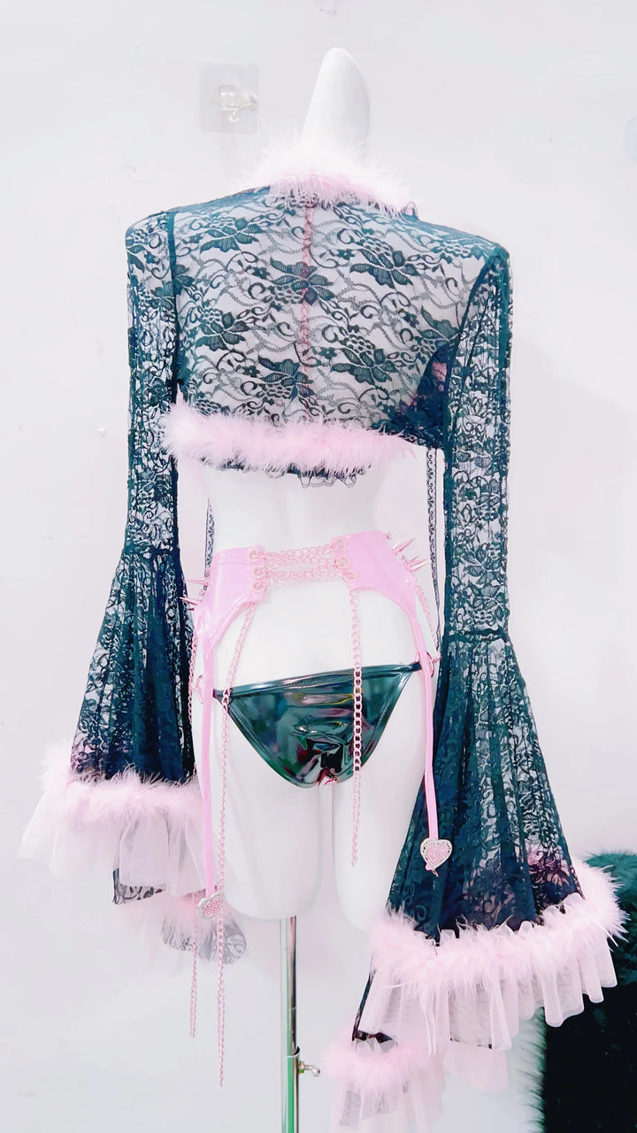 The bra top features glossy pink lacing woven through black lace, creating a corset-inspired sweetheart vibe. The matching garter skirt adds the perfect tease with crisscross ribbons, metal chains, and delicate cutouts that shape the body beautifully. The sheer robe completes the look with dramatic sleeves, soft fluffy cuffs, and a dreamy flow that moves like smoke.
