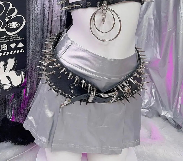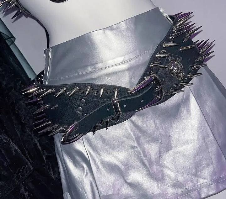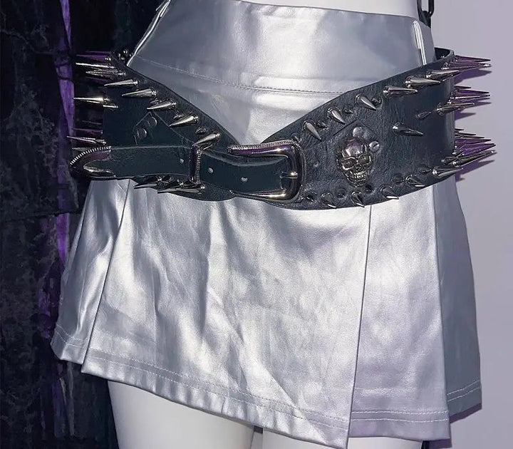 The thick faux-leather belt wraps the waist with a bold curve, packed edge-to-edge with long silver spikes that create a fierce, armor-like silhouette. A large metallic skull charm sits at the center, adding a brutal focal point that completes the dangerous aesthetic. The oversized buckle and reinforced hardware make the whole piece look rugged, dramatic, and unapologetically punk.