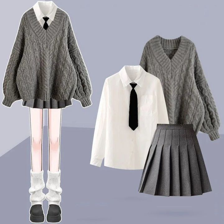 Channel timeless academia charm with the Autumn Scholar Knit Outfit Set (˶˘ᵕ˘˶)♡ Featuring a soft oversized knit sweater, classic collared blouse, pleated skirt, and matching tie, this 4-piece ensemble is the perfect mix of cozy and polished. Whether you’re heading to class, journaling at your favorite café, or just embracing the autumn aesthetic, this look wraps you in warmth and vintage-inspired elegance 🍂