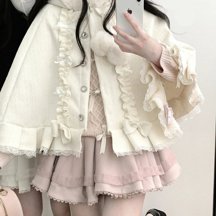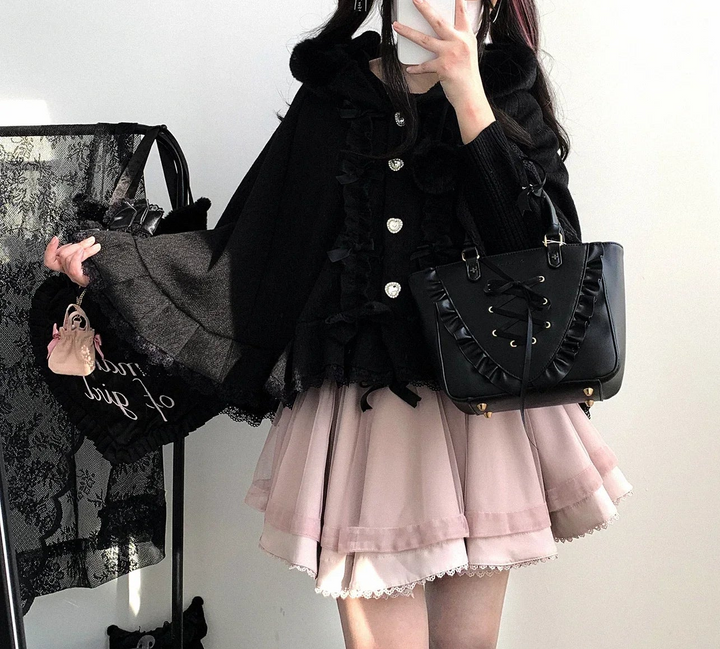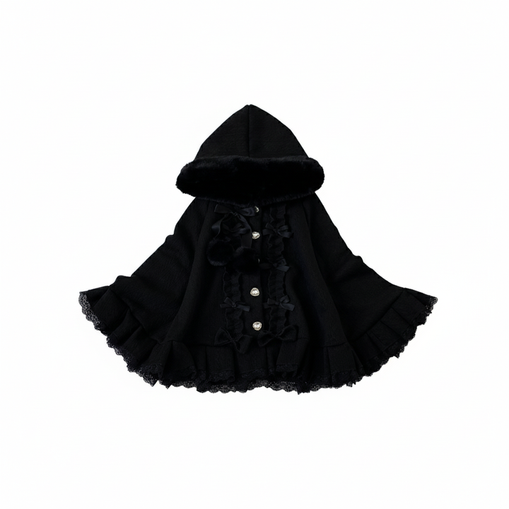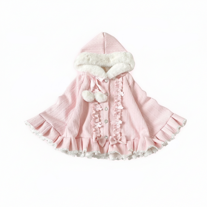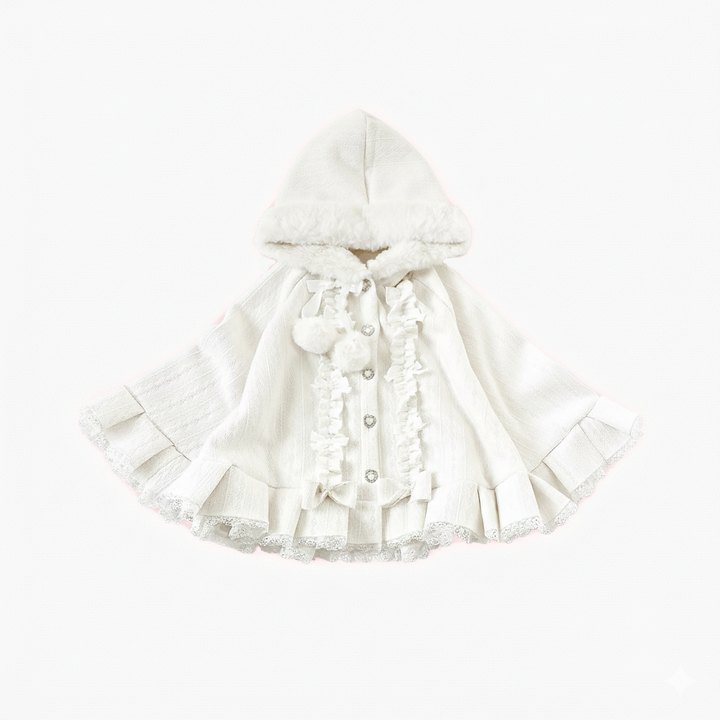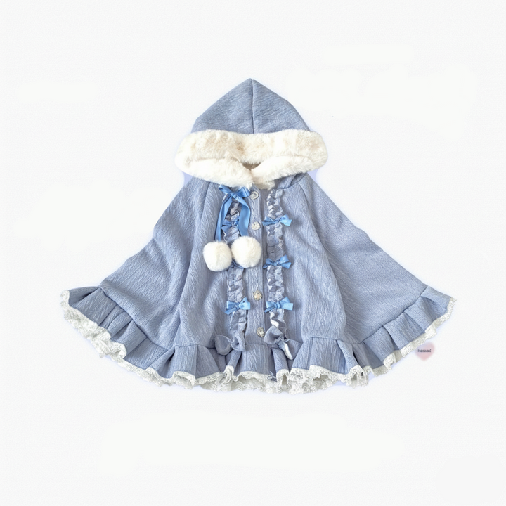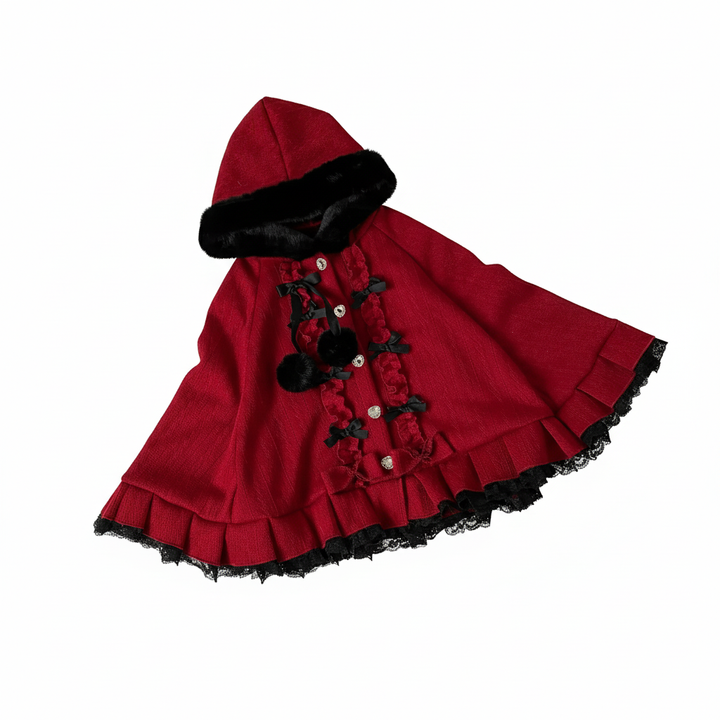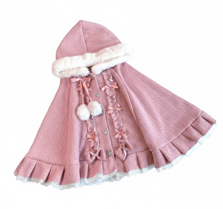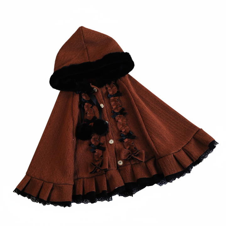 This cloak is a true ode to soft femininity — featuring ruffled lace hems, faux fur trim, and a plush hood adorned with ribbon ties and fluffy pom-poms. Its flowing, layered shape adds a delicate charm that moves gracefully with every step, creating the illusion of a doll come to life. Whether you’re wandering through cobblestone streets, sipping warm tea by candlelight, or attending a dreamy winter gathering, this cloak is your key to timeless coquette elegance.