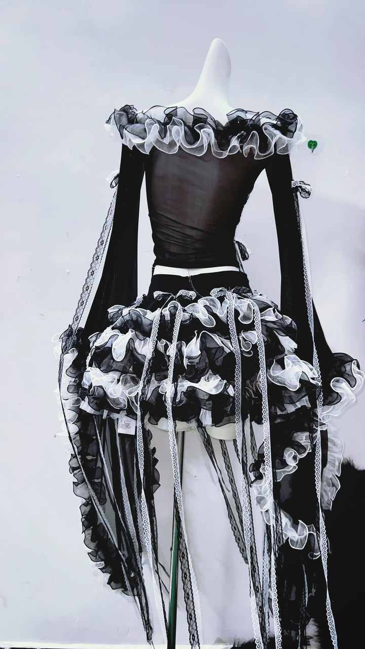 The sculpted silhouette enhances every curve with corset-style ribbons and bold contrast details, while ruffled layers and draped sleeves bring a sense of movement and power to every pose. Perfect for gothic photo shoots, fantasy events, or anyone drawn to dark celestial beauty 🌘