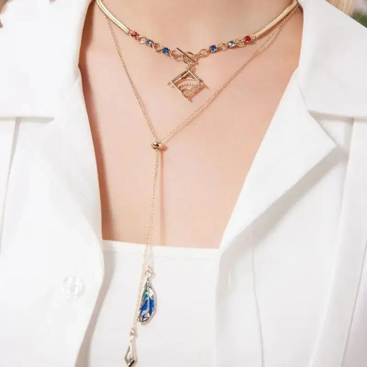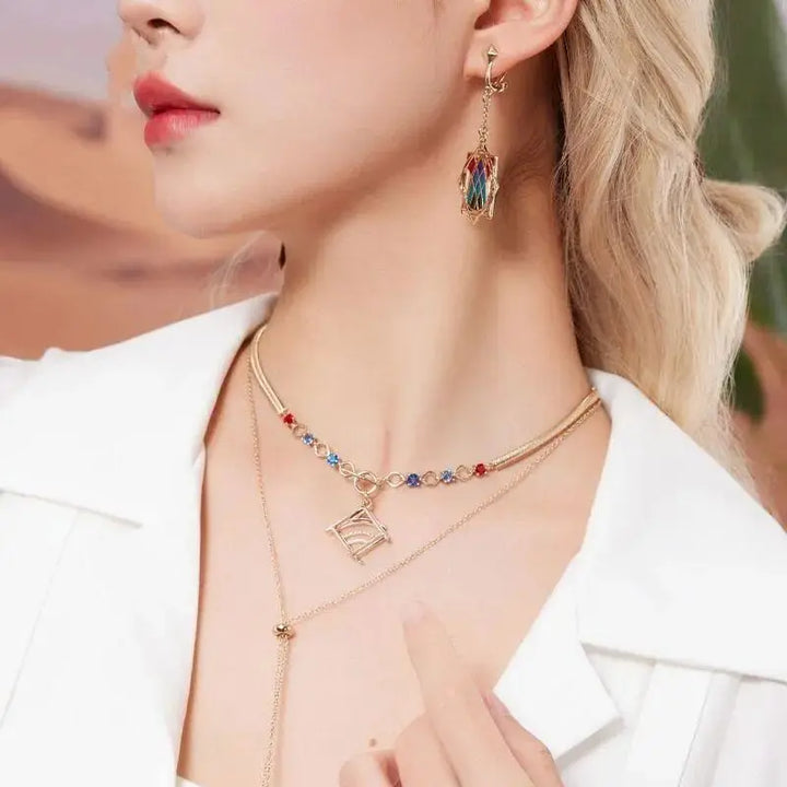 Inspired by the charm and brilliance of Kaveh, this earrings & necklace set captures his refined Sumeru aesthetic with gold detailing, gemstone accents, and elegant geometric motifs. The set includes a dainty necklace and matching earrings, perfect for cosplay, fandom collections, or adding subtle Genshin magic to your everyday style. (≧◡≦) ♡