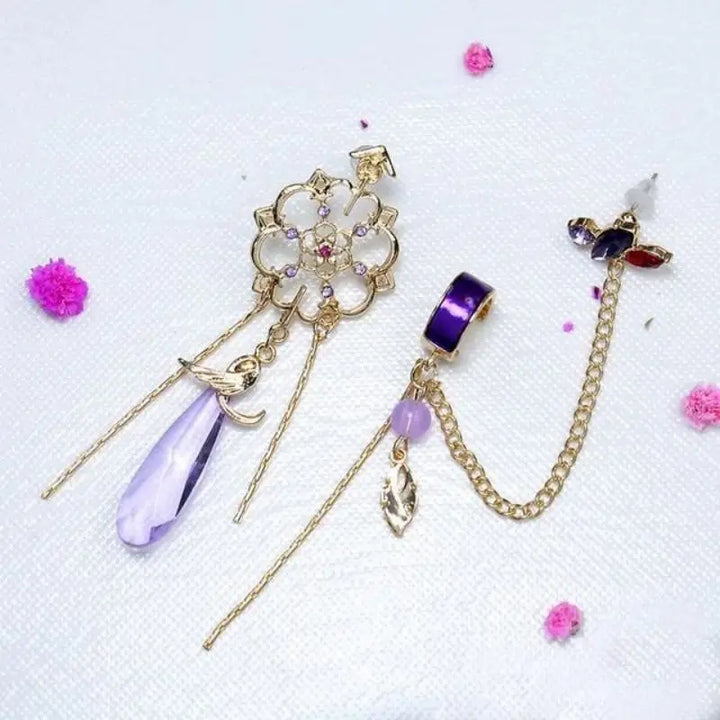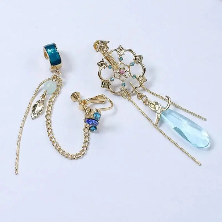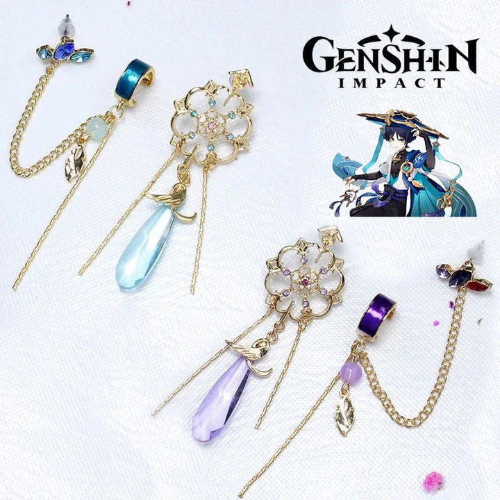Inspired by the enigmatic Scaramouche (Wanderer) from Genshin Impact, these earrings embody his mysterious yet refined aura. Featuring delicate golden frames, floral motifs, and long crystal drops in ethereal shades, they’re the perfect blend of elegance and fandom charm. Ideal for cosplay, fandom displays, or elevating your everyday aesthetic with a touch of Teyvat magic. (≧◡≦) ♡