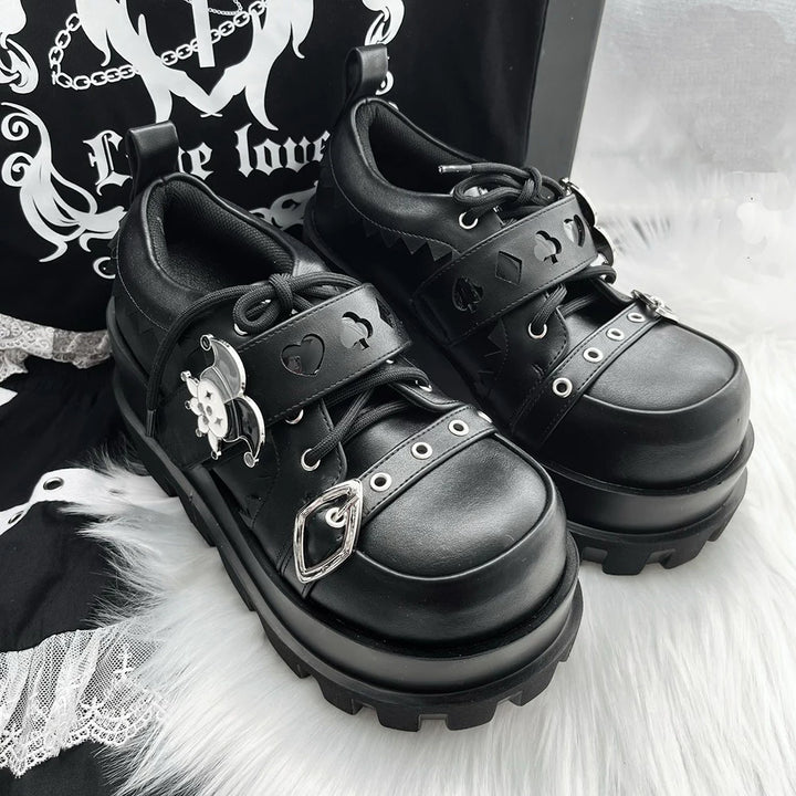 Unleash your dark kawaii side with these Gothic Punk Skull Platforms! (≧◡≦) ✧ A perfect mix of cute & edgy, these shoes feature chunky platform soles, gothic straps, and skull + heart cutout details that bring both rebellion and charm to every outfit. Designed for J-fashion, Harajuku, and alternative lovers, they’ll make you feel like the star of your own gothic fairytale ✨.