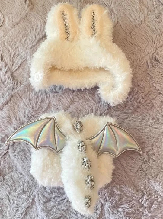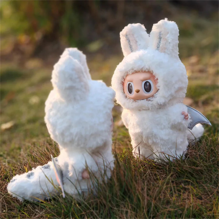 This delicate set includes a fluffy white outfit with ethereal details — iridescent angel wings, cloud-soft textures, and a perfect cozy fit. Ideal for collectors who love customizing their POP MART Labubu plushes or adding a touch of divine charm to their shelves ♡