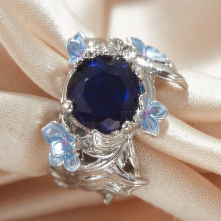 Step into elegance with the Midnight Blossom Sapphire Ring, where nature’s grace meets timeless sophistication. Featuring a brilliant deep blue sapphire centerpiece framed by delicate silver leaves and subtle crystal accents, this ring is a masterpiece of romantic design. Perfect as a unique engagement ring, anniversary gift, or a bold statement piece, it captures the mystery and beauty of a starlit night garden. (✧ω✧)♡