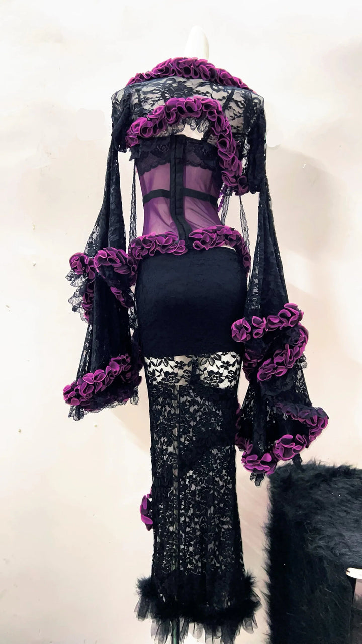 Unveil your dark allure with the Midnight Enchantress Gothic Lace Set β a breathtaking statement piece for those who live between velvet dreams and moonlit nights. Crafted with layers of black lace, deep violet ruffles, and cascading details, this outfit radiates luxury and mystery with every movement β¦ΛΒ°.