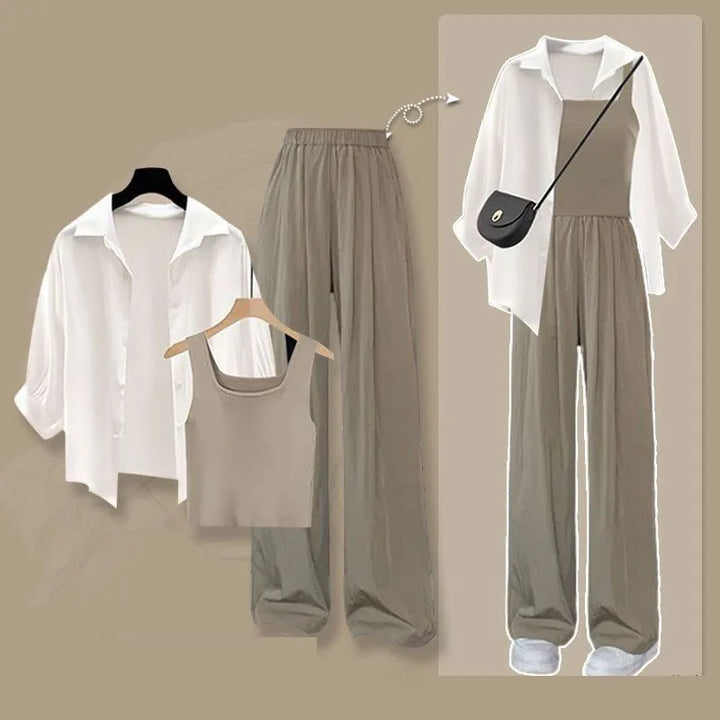 🤍 3-Piece Coordinated Set – Includes a relaxed white shirt, soft knit tank top, and airy high-waisted pants.