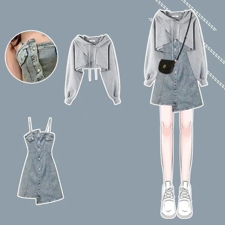☁️ Soft Hoodie Fabric – Cozy cropped sweatshirt with a loose fit that pairs perfectly with the dress or jeans.