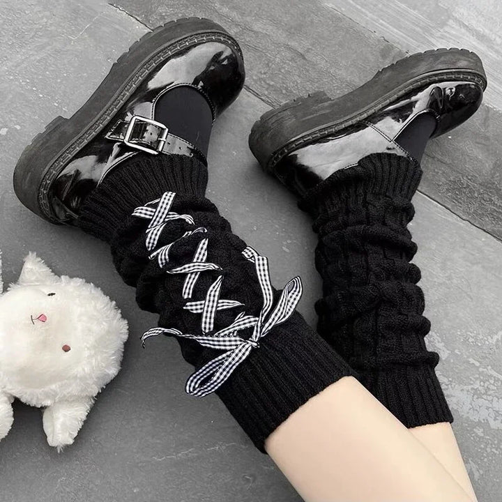 Plaid Ribbon Knit Lace-Up Leg Warmers
