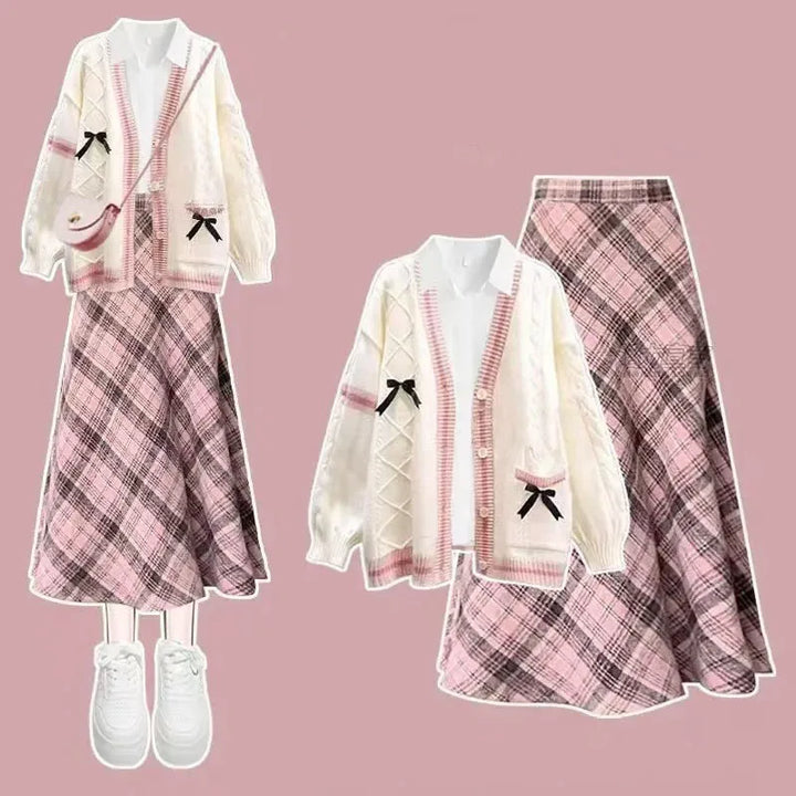 π Complete 2-Piece Set β Includes the soft cable-knit cardigan and matching plaid skirt for a perfectly coordinated outfit.