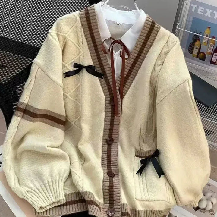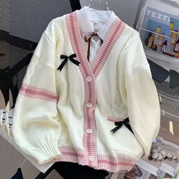 π§Ά Bow Knit Cardigan β Adorned with dainty ribbon bows and contrast trim for a feminine vintage touch.