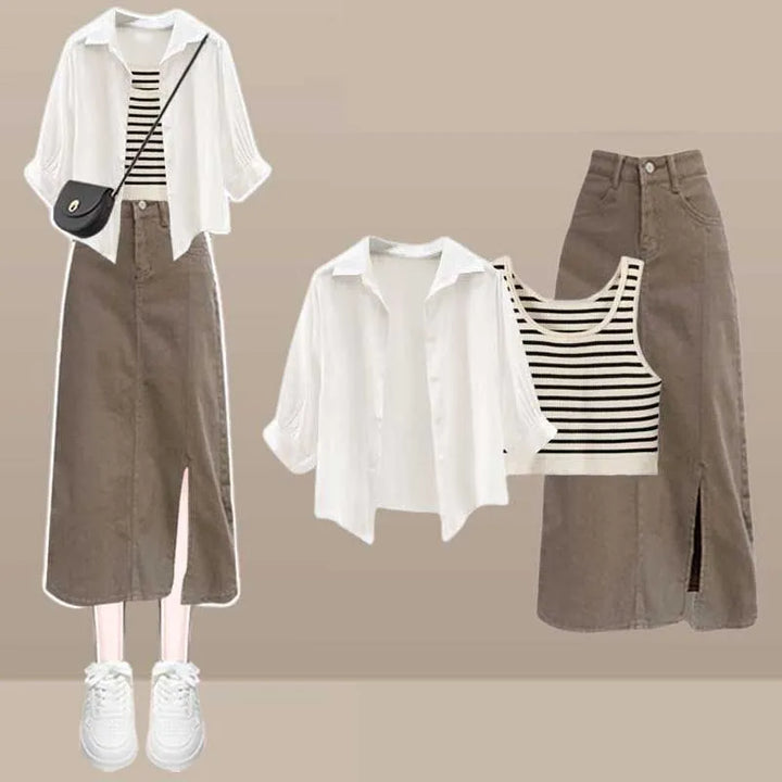 🤎 Complete 3-Piece Set – Includes a white blouse, fitted knit tank, and buttoned midi skirt for a perfectly balanced silhouette.