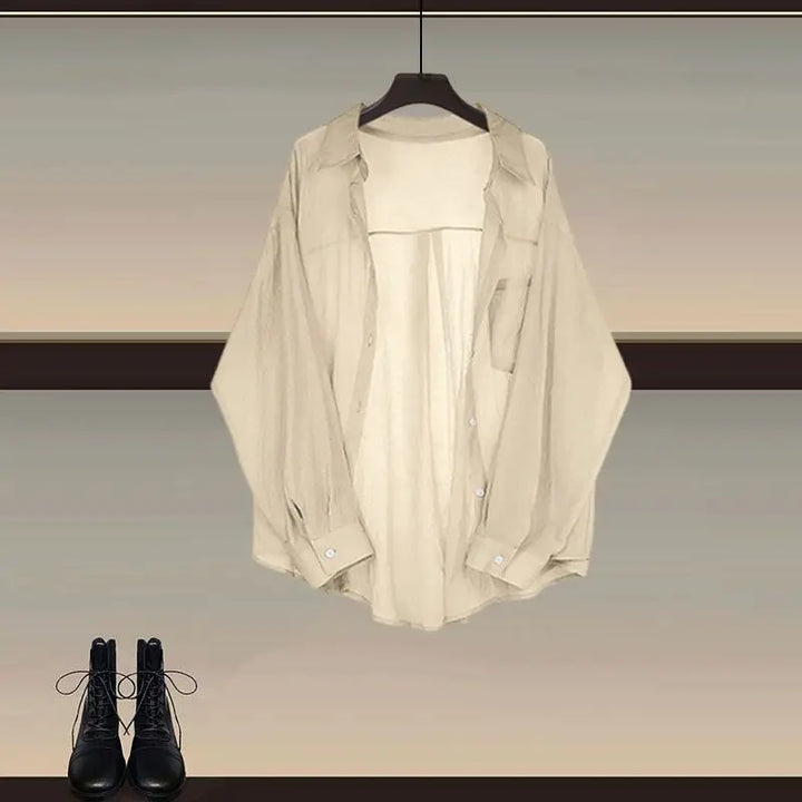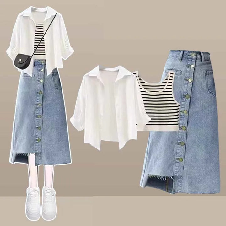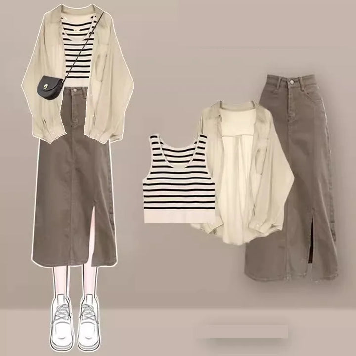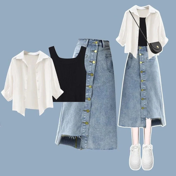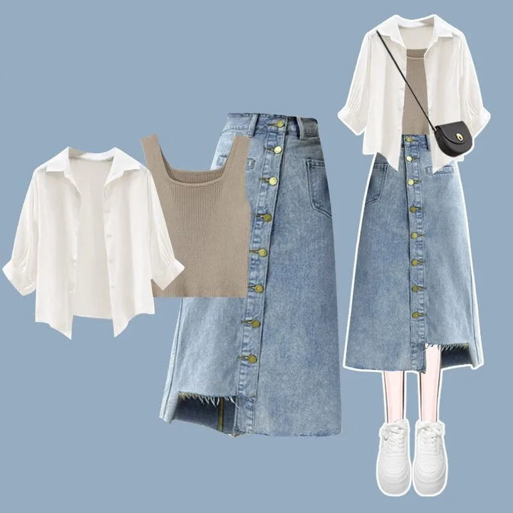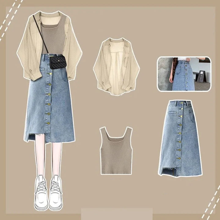 Embrace timeless minimalism with the Urban Muse Layered Outfit Set (⸝⸝ᵕᴗᵕ⸝⸝)♡ Designed for comfort and sophistication, this 3-piece ensemble blends casual elegance with soft neutral tones. The classic button-up blouse, cozy tank, and A-line denim or cotton skirt create a flattering layered look that’s perfect for city strolls, coffee dates, or slow weekends spent exploring bookstores ✿