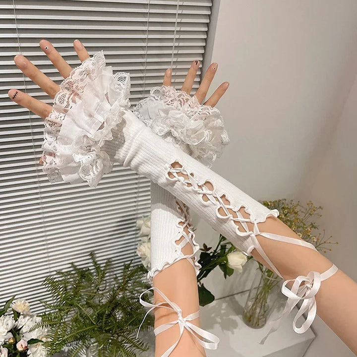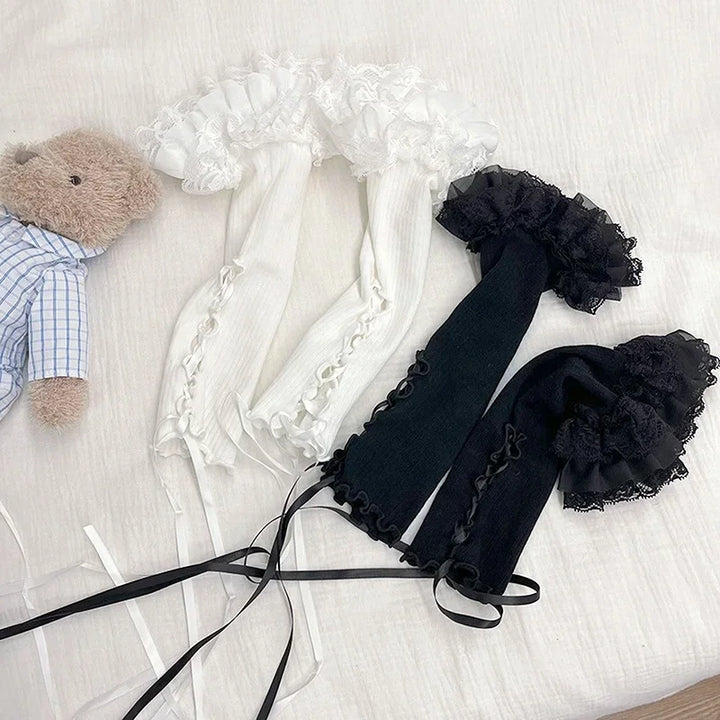 Step into an elegant fairytale with these lace-up ruffle arm warmers – a coquette, gothic, and vintage-inspired accessory that adds instant magic to any outfit. With soft knitted fabric, delicate ribbon lace-up details, and dramatic ruffled cuffs, these arm warmers feel like a mix between a romantic Victorian story and a modern kawaii aesthetic. (qβ™₯β€Ώβ™₯q)