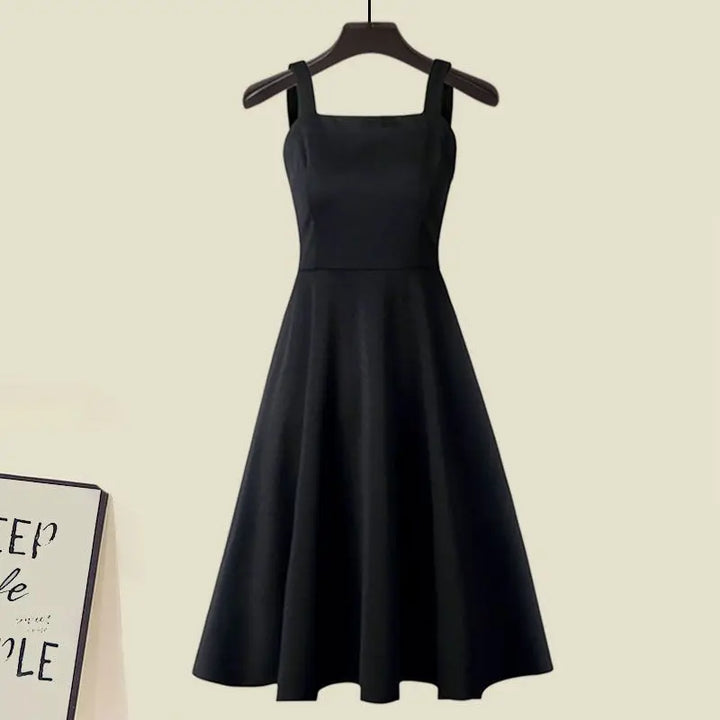 🖤 Flattering Midi Dress – Sleeveless, with a structured waist and flowing skirt that enhances every movement.