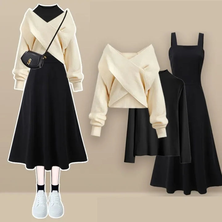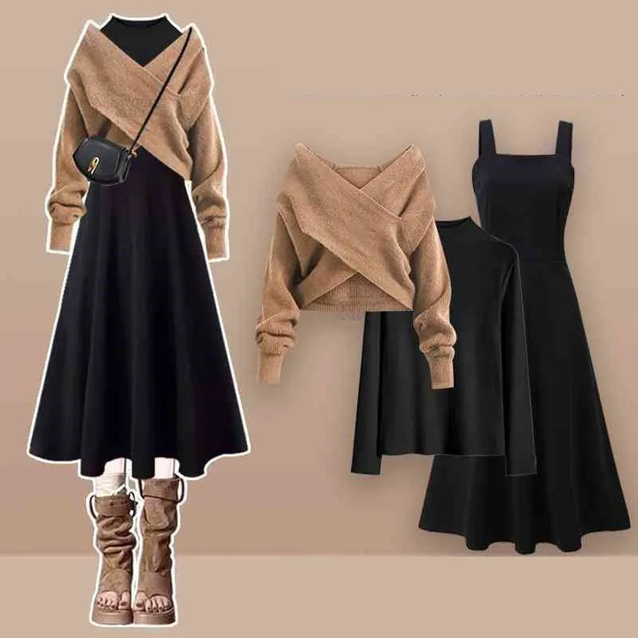 🩰 2-Piece Coordinated Set – Includes the off-shoulder wrap sweater and the classic A-line midi dress for a ready-to-wear elegant combo.