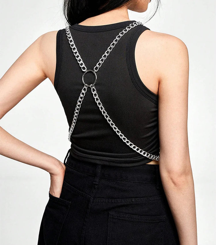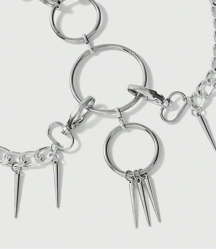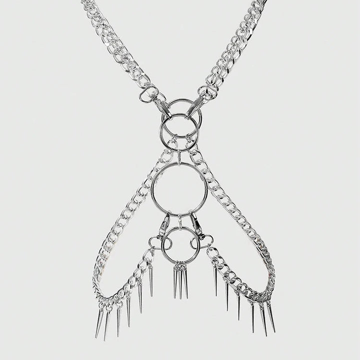 Thick silver chains cross over the shoulders and connect through a dramatic series of oversized O-rings down the center of the torso. Smaller chains wrap around the waist, finished with dangling spike charms that move with every step. The back features a clean criss-cross chain design that hugs the body and adds structure without restricting movement.