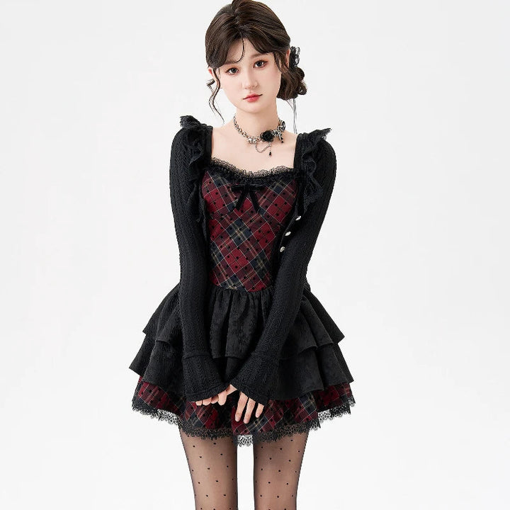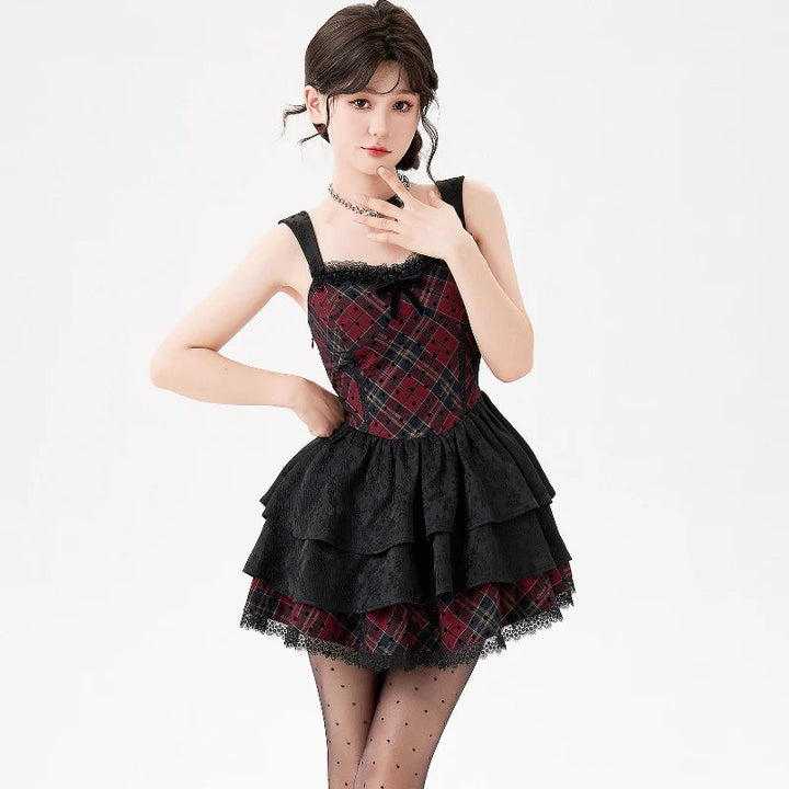 The corset-style bodice features a striking crimson plaid pattern trimmed with soft lace, cinching the waist for the perfect deadly-cute silhouette. The layered lace skirt adds bounce and drama, creating the ultimate dark-doll twirl effect. The matching sleeves bring extra edge with their long, fitted shape — giving the whole outfit that elegant-but-feral punk-coquette vibe.