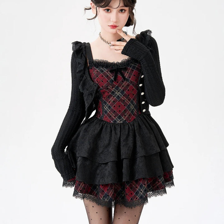 🖤 Black lace + crimson plaid contrast