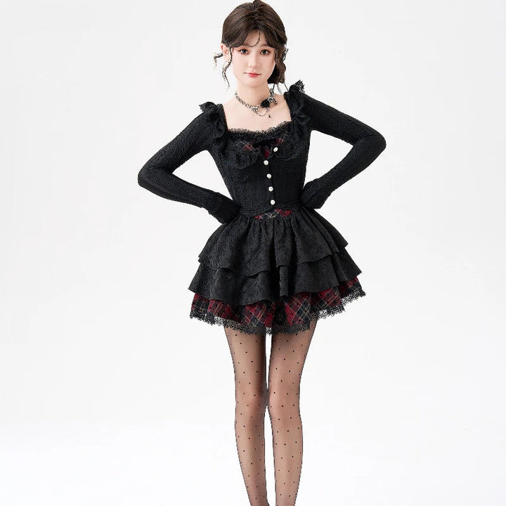 Step into fierce doll energy with the Crimson Punk Coquette Lace Outfit Set — a gothic-meets-punk fantasy that blends dark dollette sweetness with bold, rebellious attitude. This outfit has that viral TikTok “dangerously pretty” vibe, mixing black lace, deep red plaid, and layered ruffles for a look that feels like a gothic princess with a punk heart.