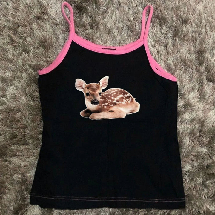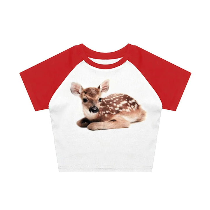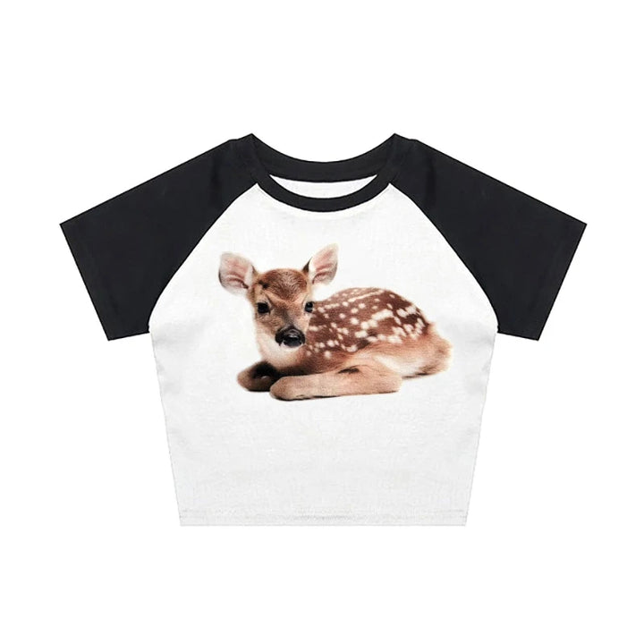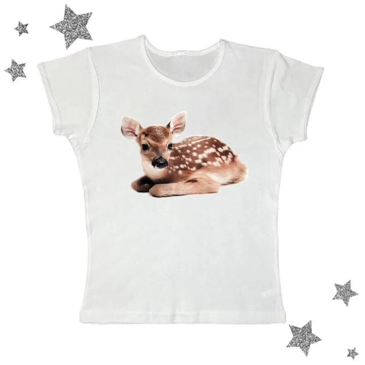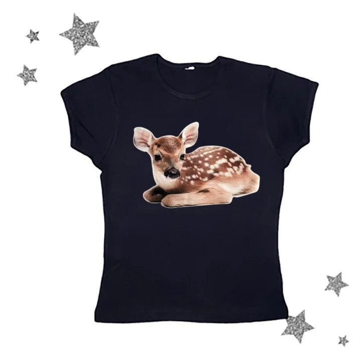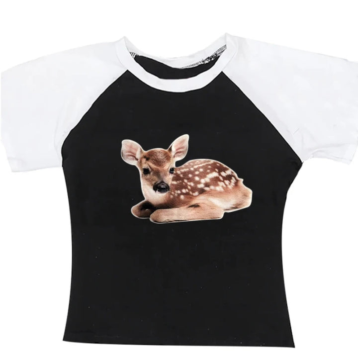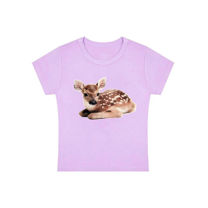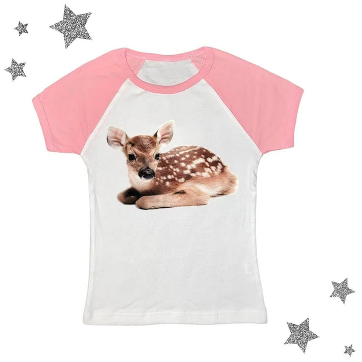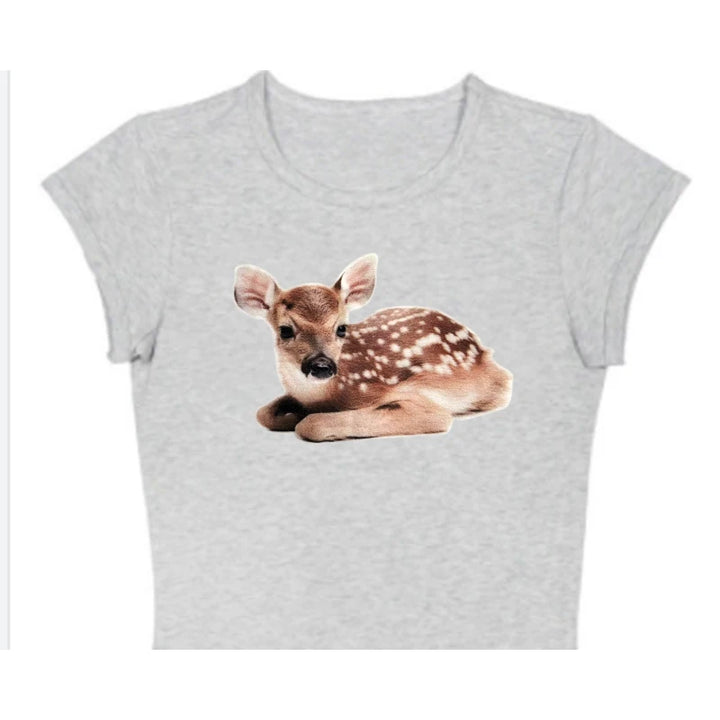 The tops are soft, stretchy, and easy to style with skirts, jeans, leg warmers, or cardigans. Whether you prefer sweet pastels, classic neutrals, or grunge-inspired camo, each option keeps the adorable fawn artwork front and center.