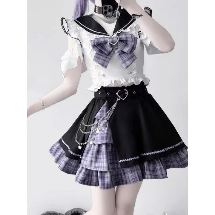 💜 3-Piece Set – Includes the cropped ruffle top, plaid pleated skirt, and matching oversized ribbon bow for a complete look.