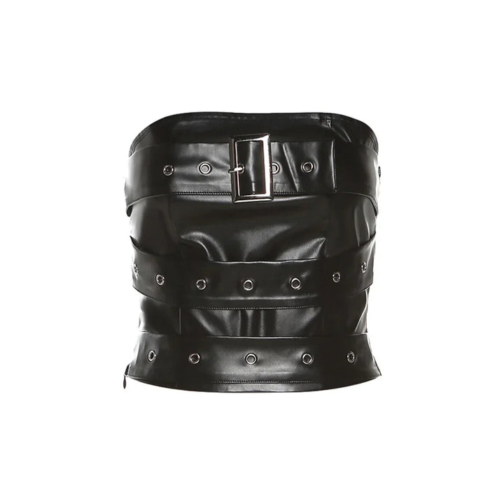 The strap-buckle tube top is the star of the look ā structured, sharp, and covered in metal hardware that gives instant attitude. Paired with the pleated leather mini skirt, the silhouette becomes fierce and sculpted, giving that ādonāt bother meā aura. Each buckle, belt, and eyelet adds intensity, making the fit look like a perfect mix of alt-princess and cyber-vixen.