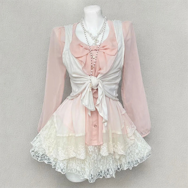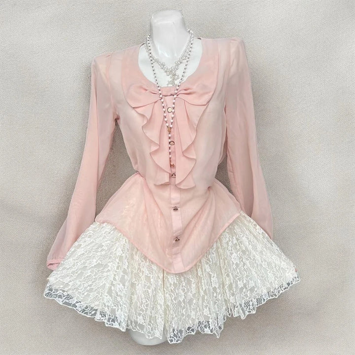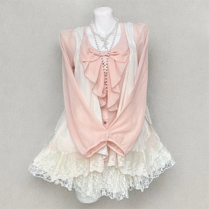 The peach chiffon top drapes softly with long flowy sleeves and a big coquette bow that adds instant girly elegance. Layered underneath, the creamy lace skirt brings volume, flutter, and that sugary dollette silhouette everyone is obsessed with. Together, the textures create a soft, ethereal glow that photographs beautifully from every angle — warm, sweet, and ultra-feminine.