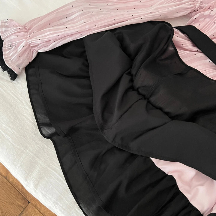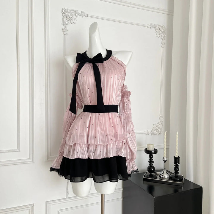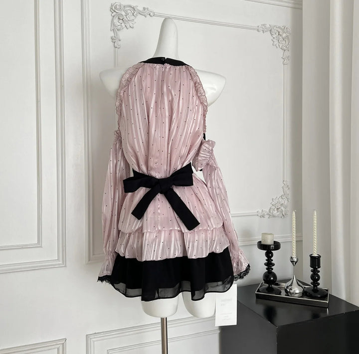 The off-shoulder sleeves drape delicately for a sweet, doll-like look, while the layered black skirt adds movement and balance. The entire piece feels playful, feminine, and effortlessly pretty — like something straight out of a pastel daydream.