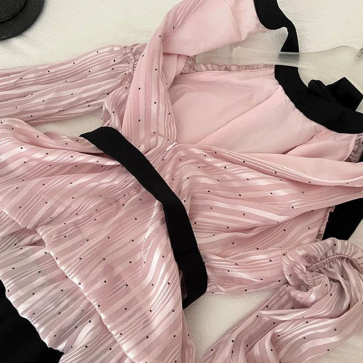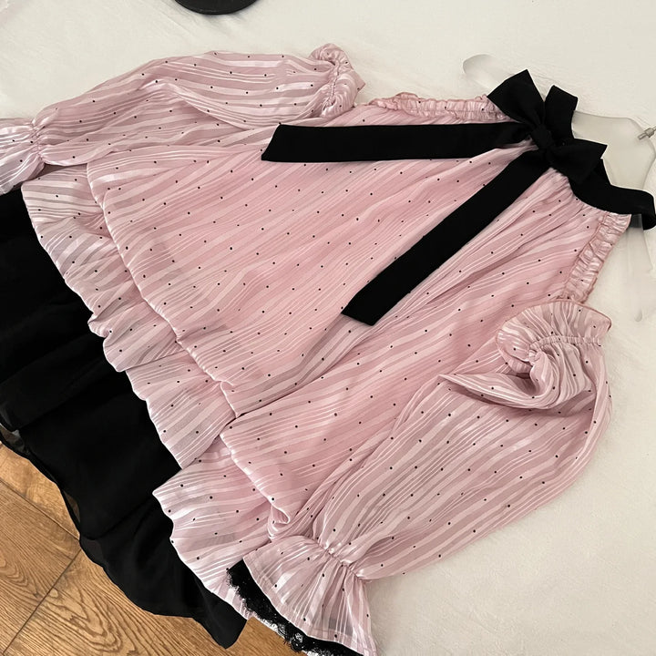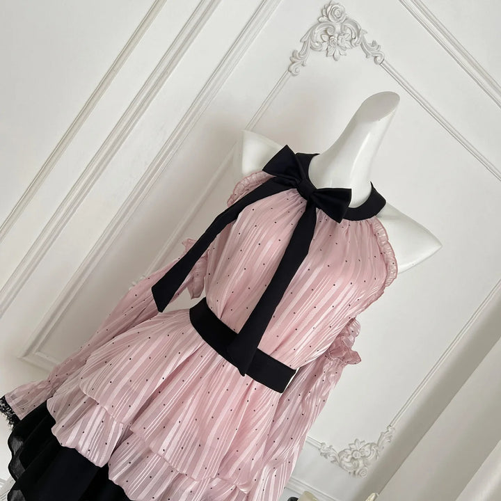 The Ribbon Melody Soft Coquette Set captures the perfect blend of girly elegance, dollette charm, and dreamy pastels. The pink tiered top is light and flowy with subtle sparkle, giving it a soft, romantic silhouette. Black ribbon accents add contrast and structure, creating that signature coquette aesthetic.
