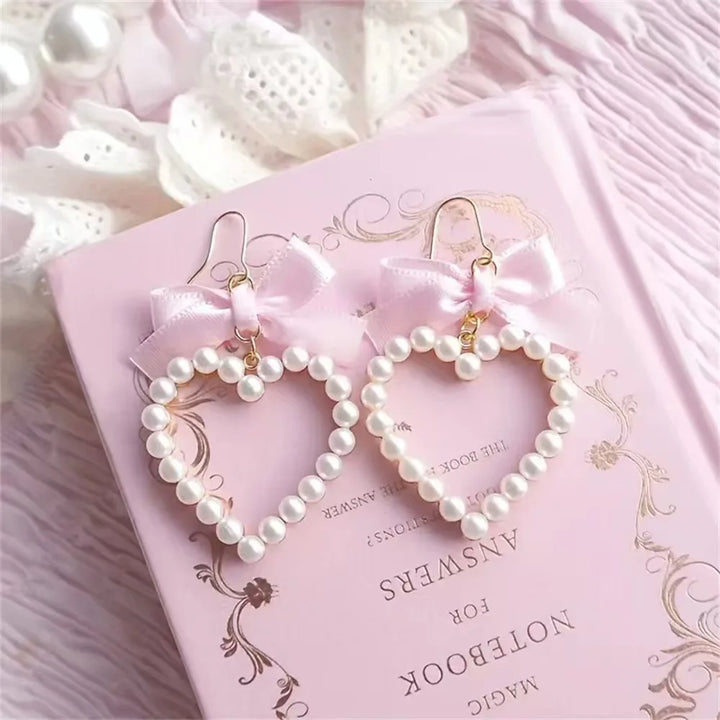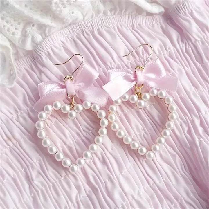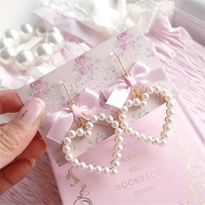 Fall in love with every detail of the ✧ Sweet Pearl Heart Bow Earrings ✧ — a dainty blend of elegance, softness, and romantic coquette charm (。•́‿•̀。)♡ These heart-shaped beauties are the perfect statement for dreamy souls who adore ribbons, lace, and pastel magic.
