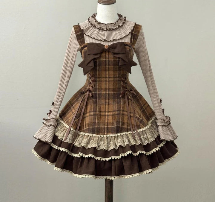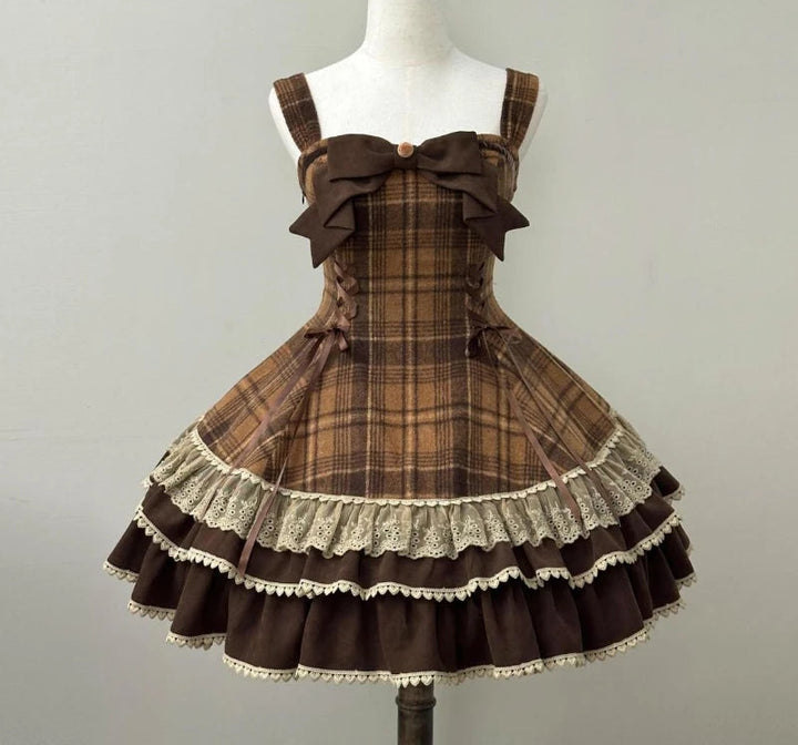 The dress features a structured bodice with big ribbon bows, a plaid pattern that feels nostalgic and cozy, and layered ruffle tiers that create the perfect twirl effect. Every detail — from the lace trim to the gentle warm palette — adds to the soft, vintage-princess aesthetic. The matching capelet completes the look with cottagecore magic, giving the entire outfit that “warm tea, old books, autumn leaves” vibe.