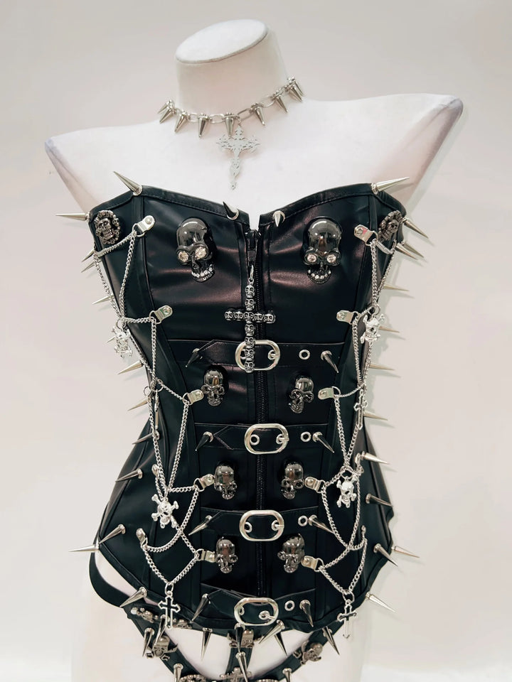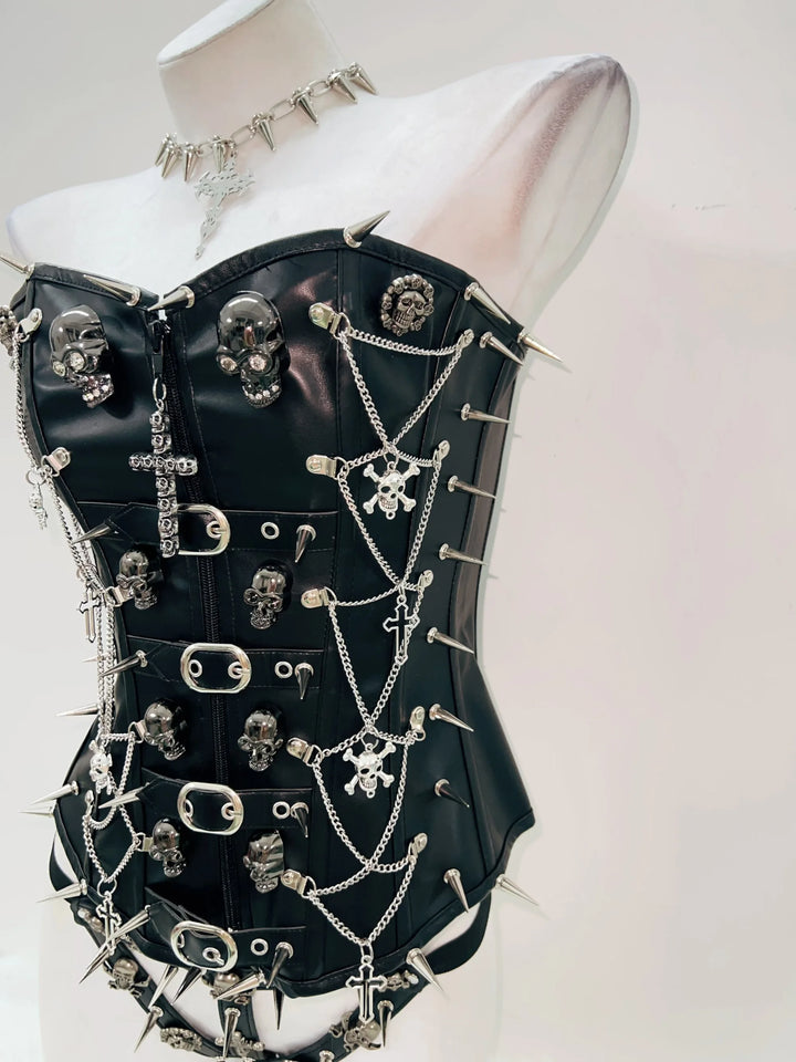 Every inch of this corset is loaded with hardware. Rows of skull plates, chained crosses, metal O-rings, and sharp studs wrap around the body in a cage-like formation. The sculpted faux-leather base creates a cinched, dominant silhouette, while the hip straps and dangling chains finish the design with brutal edge.