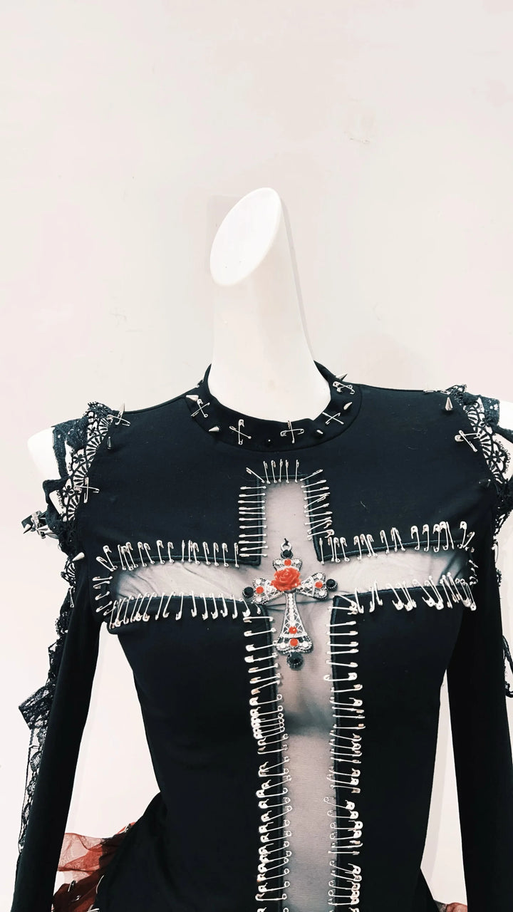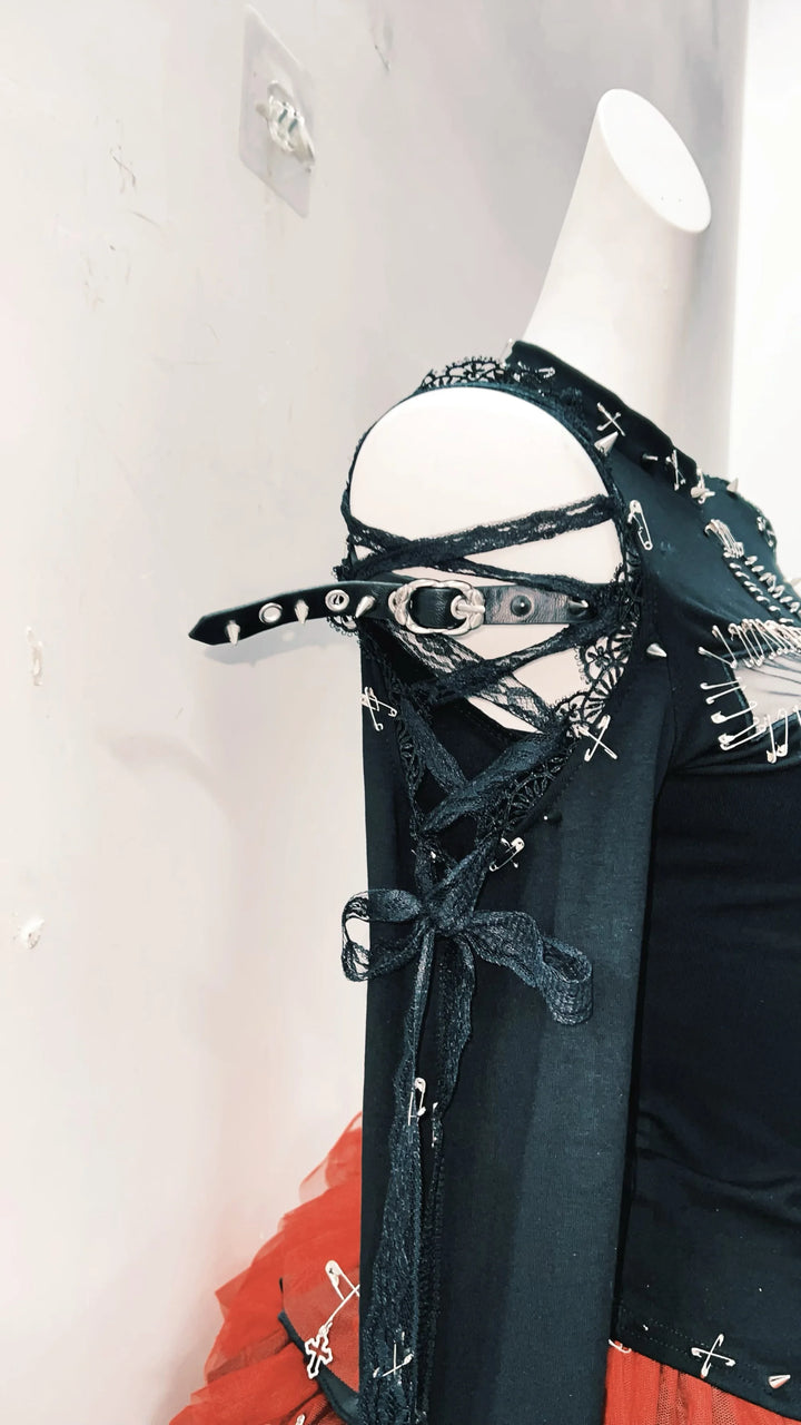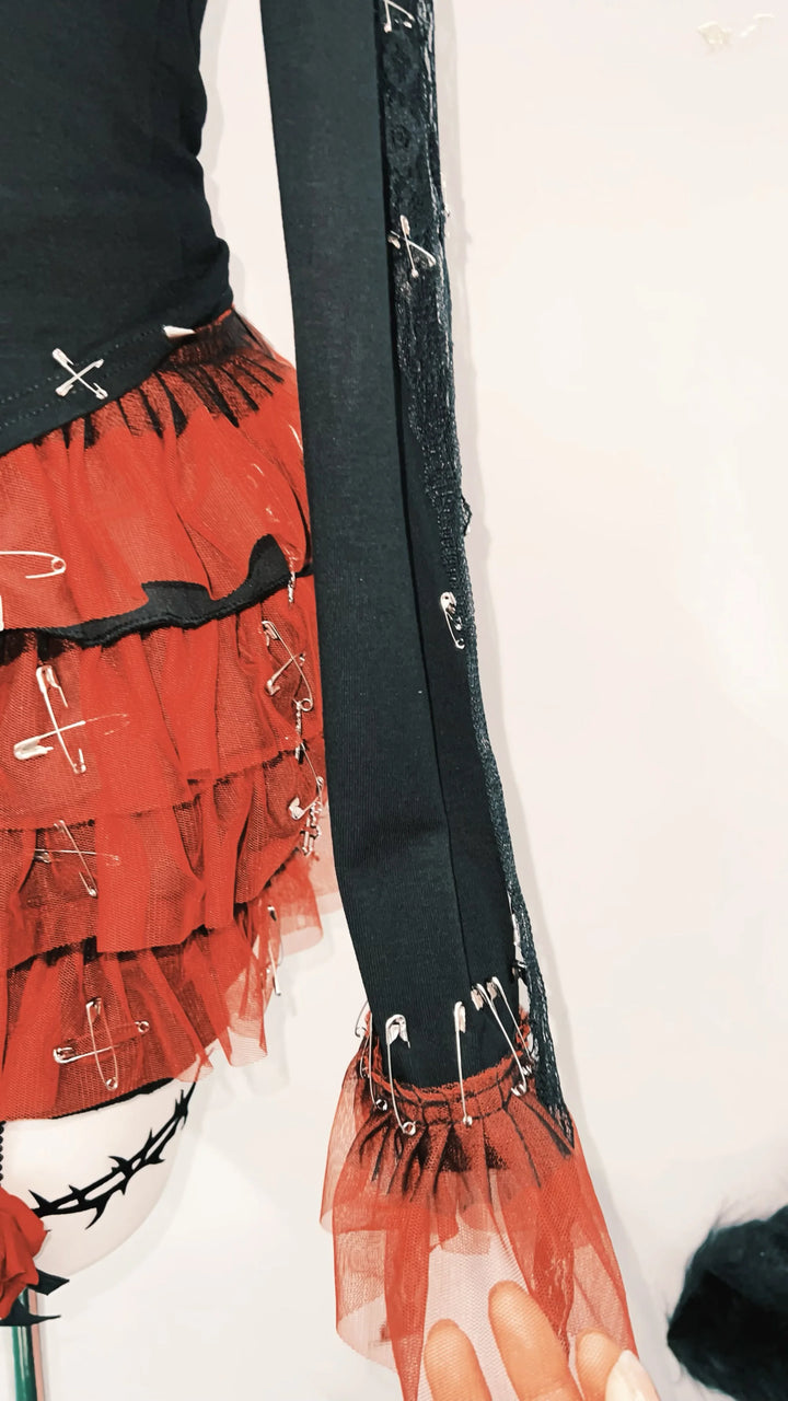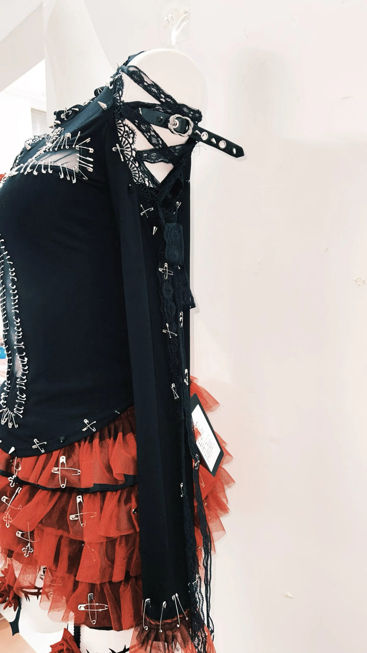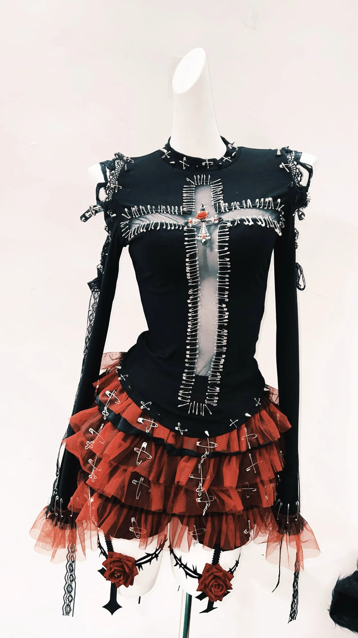 The Blood Rose Punk Gothic Set mixes fiery red drama with dark punk elegance. The black top is shaped with a bold center cut-out and detailed with silver hooks, chains, and stitched accents that give it a stitched-doll, deconstructed aesthetic. Long sleeves and shoulder hardware add a sharp, rebellious edge.