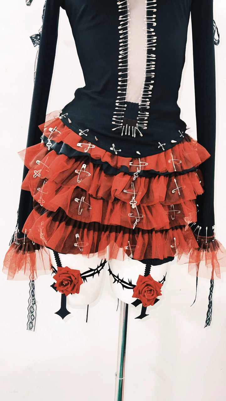The matching skirt is a layered explosion of red ruffles, black lace, chains, and rose appliqués. Each tier moves with attitude, while the metal hardware gives it a grunge-punk twist. Roses along the hem add a romantic, dangerous touch — like something out of a gothic fairytale.